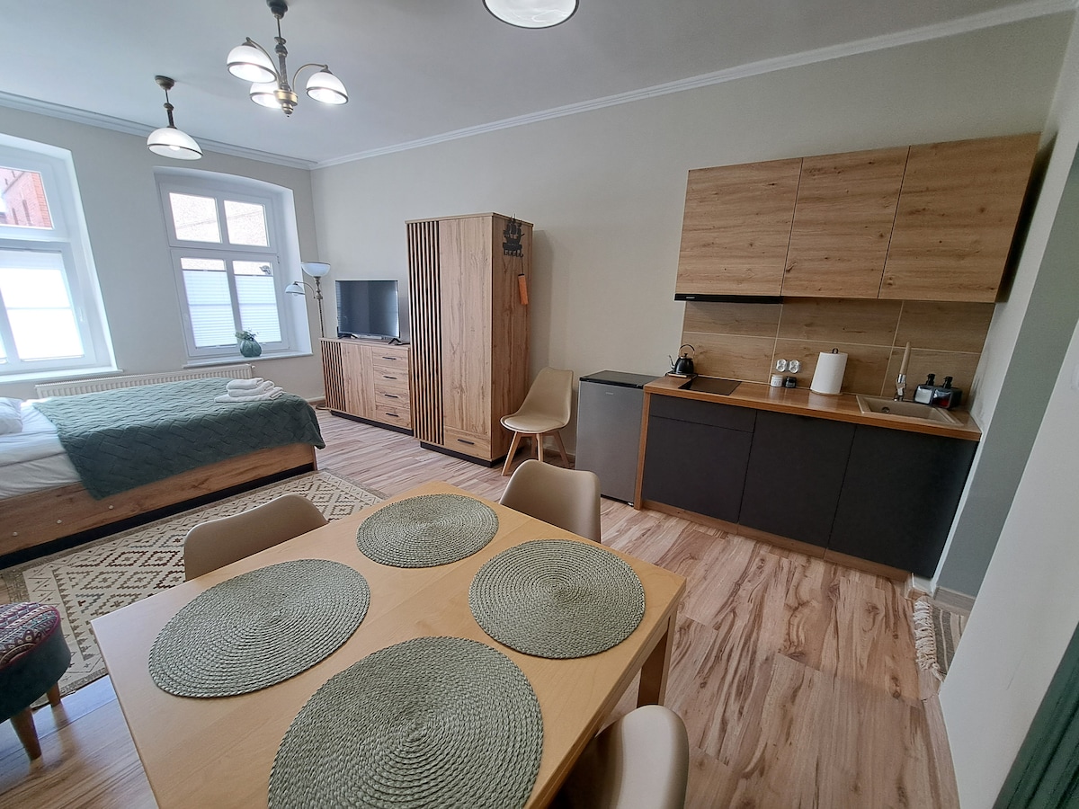 Apartamentul este situat într-o zonă liniștită și liniștită de pe bulevard. Drwęckiego, în același timp aproape de centru și de facilitățile culinare și gastronomice. Până în centrul orașului, la 10 minute de mers pe jos de-a lungul lacului, lângă terenurile de tenis, plaja orașului, închirierea de echipamente de apă și teleschiurile. La dispoziția oaspeților, 56 de metri de spațiu mobilat confortabil. Apartamentul este format dintr-o bucătărie complet utilată, un living, un dormitor, o baie și un balcon cu vedere la lac.