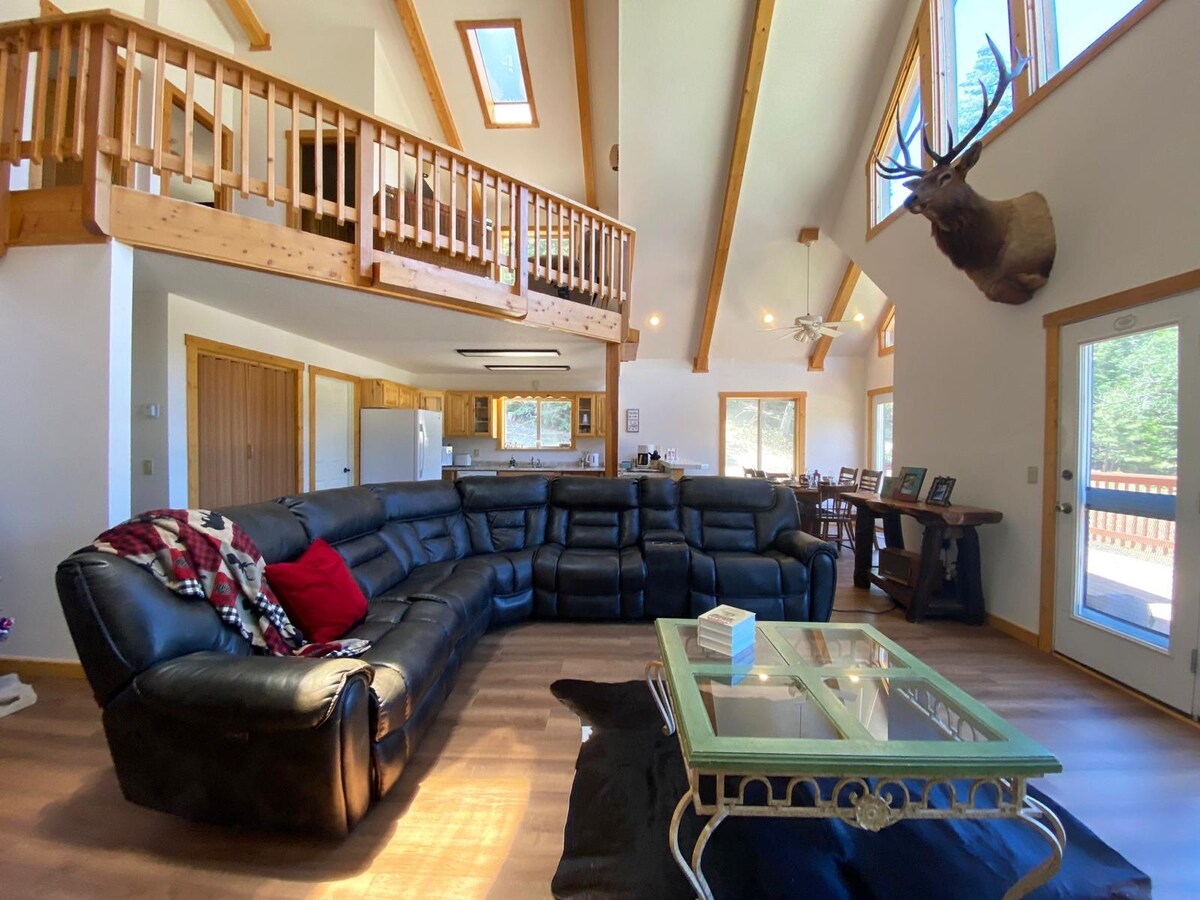 Cabană cu concept deschis complet renovată. Are 3 dormitoare private, o cameră suprapusă privată mare, care are o zonă de living separată cu 3 paturi suprapuse de dimensiune completă, o bucătărie deschisă, zonă de cameră de familie și 3 băi complete. Afară vei găsi o frumoasă înfășurare acoperită în jurul punții, cu grătar BBQ, cadă cu hidromasaj și o mulțime de locuri pentru a te bucura de priveliști uluitoare. Poate găzdui între 8 și 12 persoane. Curtea este în formă de zerosc, inclusiv zone cu gazon pentru jocuri de gazon și o groapă de foc în aer liber. Cabană PENTRU NEFUMĂTORI și fără animale de companie.