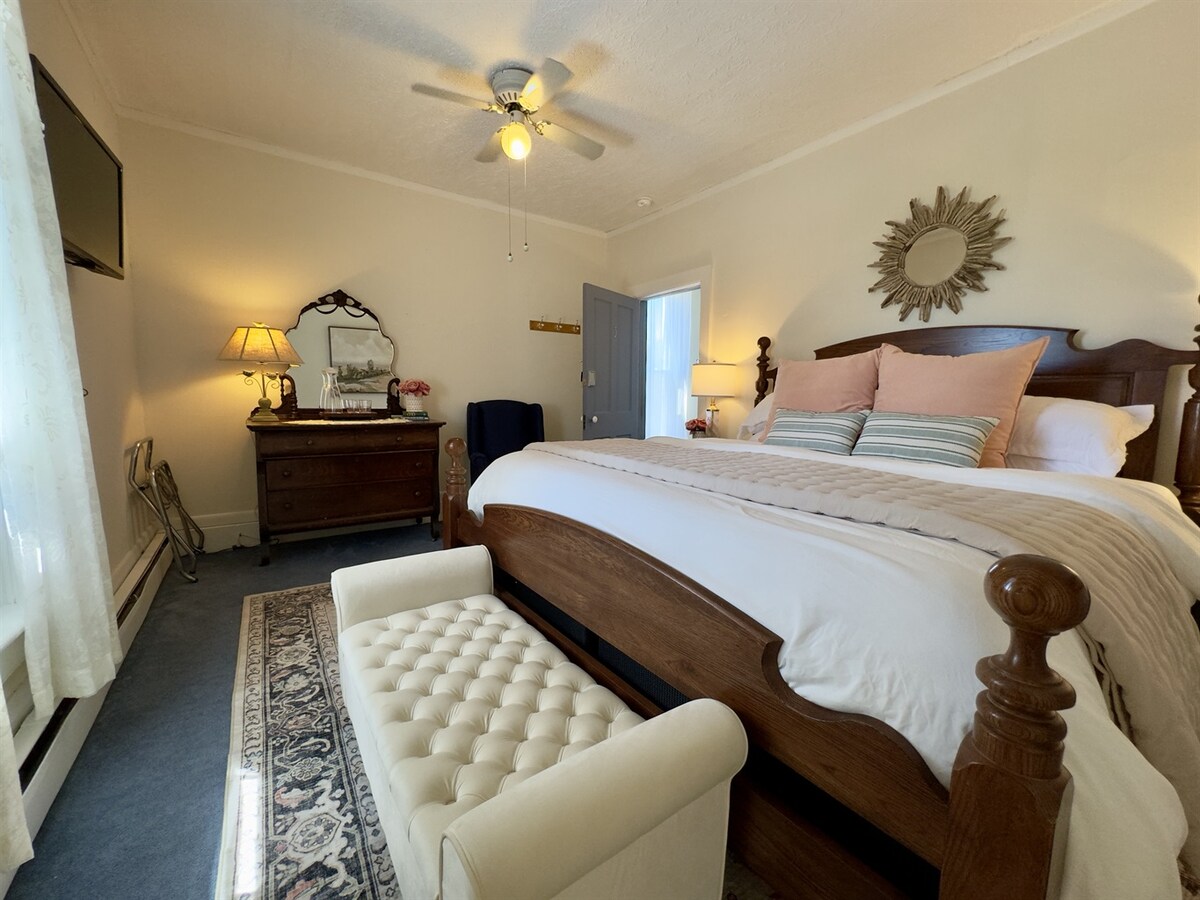 **Captain's Corners Suite** Camera 9 Sărbătorește sărbătorile în acest apartament spațios și elegant, perfect pentru familii, grupuri sau cupluri. Găzduind până la 8 oaspeți, are două dormitoare matrimoniale, 2 șeminee de epocă, o bucătărie complet utilată și o spălătorie. Relaxează-te în zona de relaxare confortabilă, cu canapele elegante, trei televizoare cu ecran plat și o baie privată privată. Bucură-te de un mic dejun continental cu autoservire în zilele lucrătoare și de un mic dejun cald festiv în sala de mese principală în weekend.