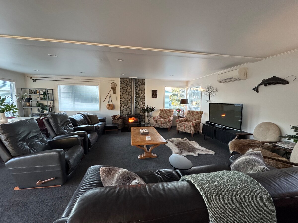 Fabulous all season house suitable for larger groups/multiple families. 4 bedrooms, and 3 bathrooms. 2 master bedrooms both with ensuites and TV's. Another Queen bedroom and a bunk room share another bathroom. Sleeps 9 guests in absolute comfort. Large living area that flows to a huge deck with built in pizza oven and BBQ. Trout House has it all, views of Mt Pihanga, sun, airconditioning and a wood burning fire & heat pump for winter. Fully equipped new kitchen & laundry. Space for kids to run.