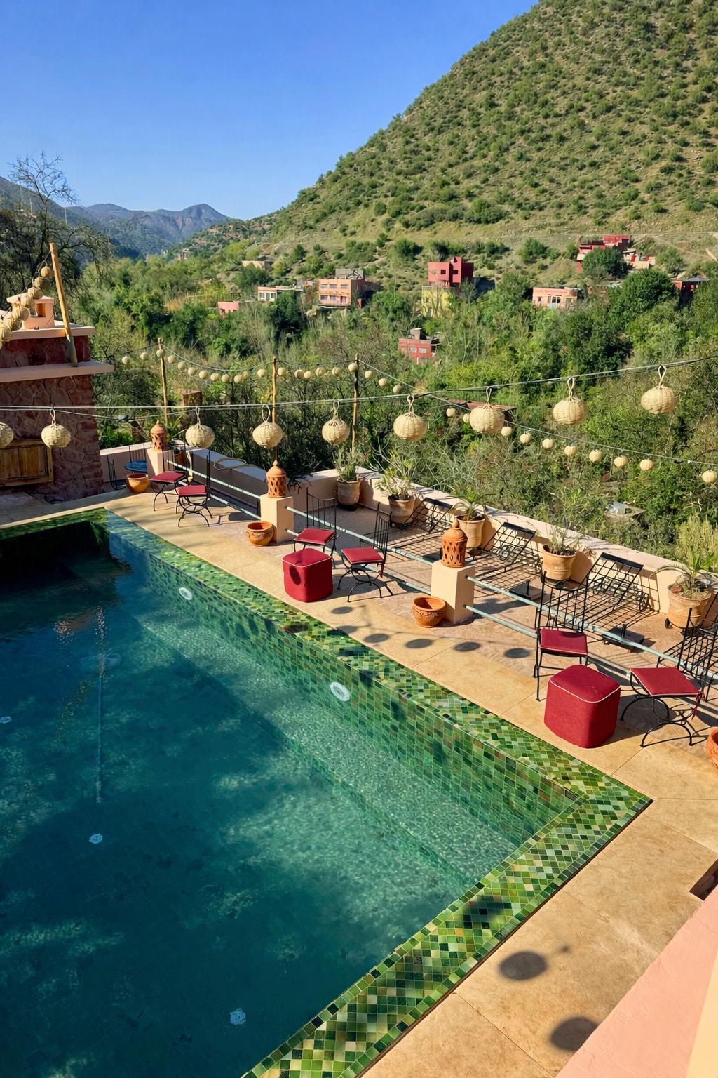 Just 45 minutes from the bustling heart of Marrakech lies Ourika – a lush green valley where the mountains meet the river. The landscape is alive with terraced gardens, sparkling water, and fresh mountain air. Here, at Villa Ourika, you are invited to slow down, savour the moment, and connect with Moroccan life. Whether it’s joining a traditional cooking class using fresh produce from our gardens, or simply relaxing by the pool, every detail is designed to immerse you in the valley’s rhythm.
