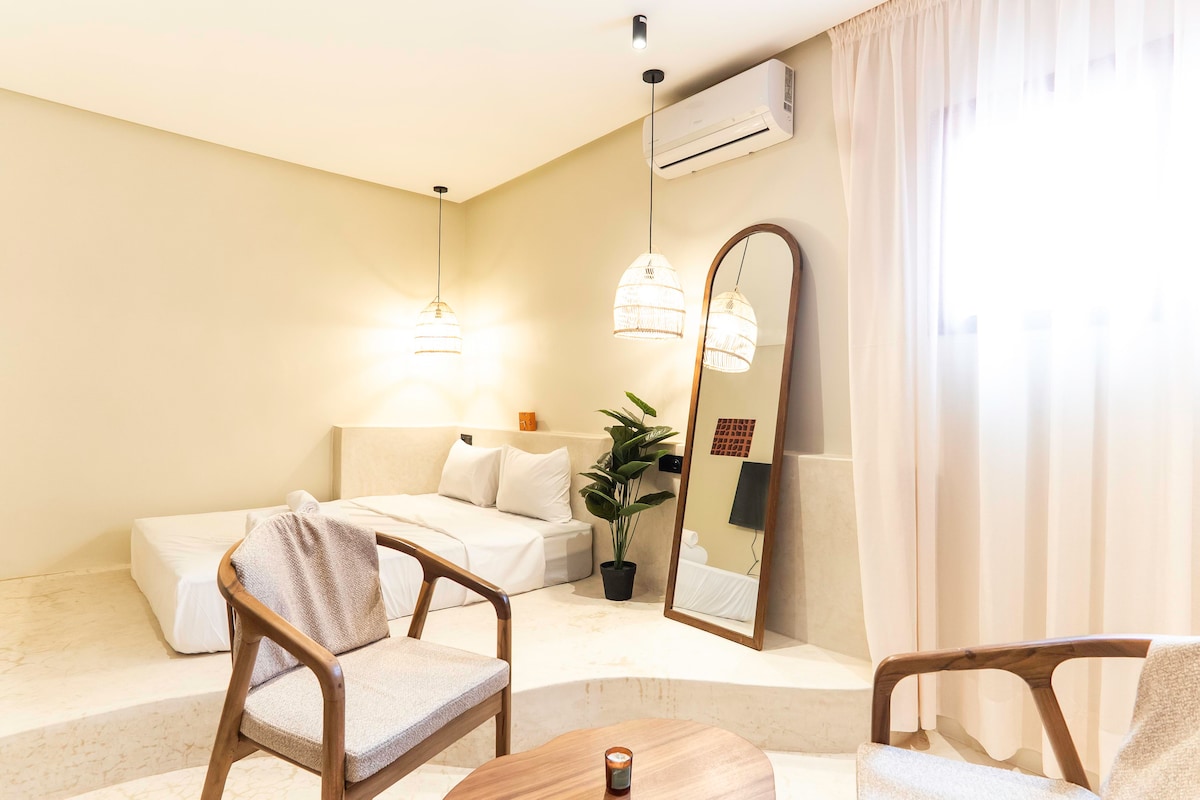 Bine ai venit în oaza ta privată din inima orașului Marrakech, un studio de inspirație tropicală conceput în jurul unui concept pur și liniștitor. Aici, fiecare detaliu te invită să te relaxezi, între natură, lumină și confortul modern • piscina privată mică în aer liber pentru un moment de bunăstare • duș răcoritor în aer liber, atmosferă naturală • Terasă tropicală ideală pentru relaxare sau împărțirea mesei • Decor atent cu tonuri și materiale naturale.