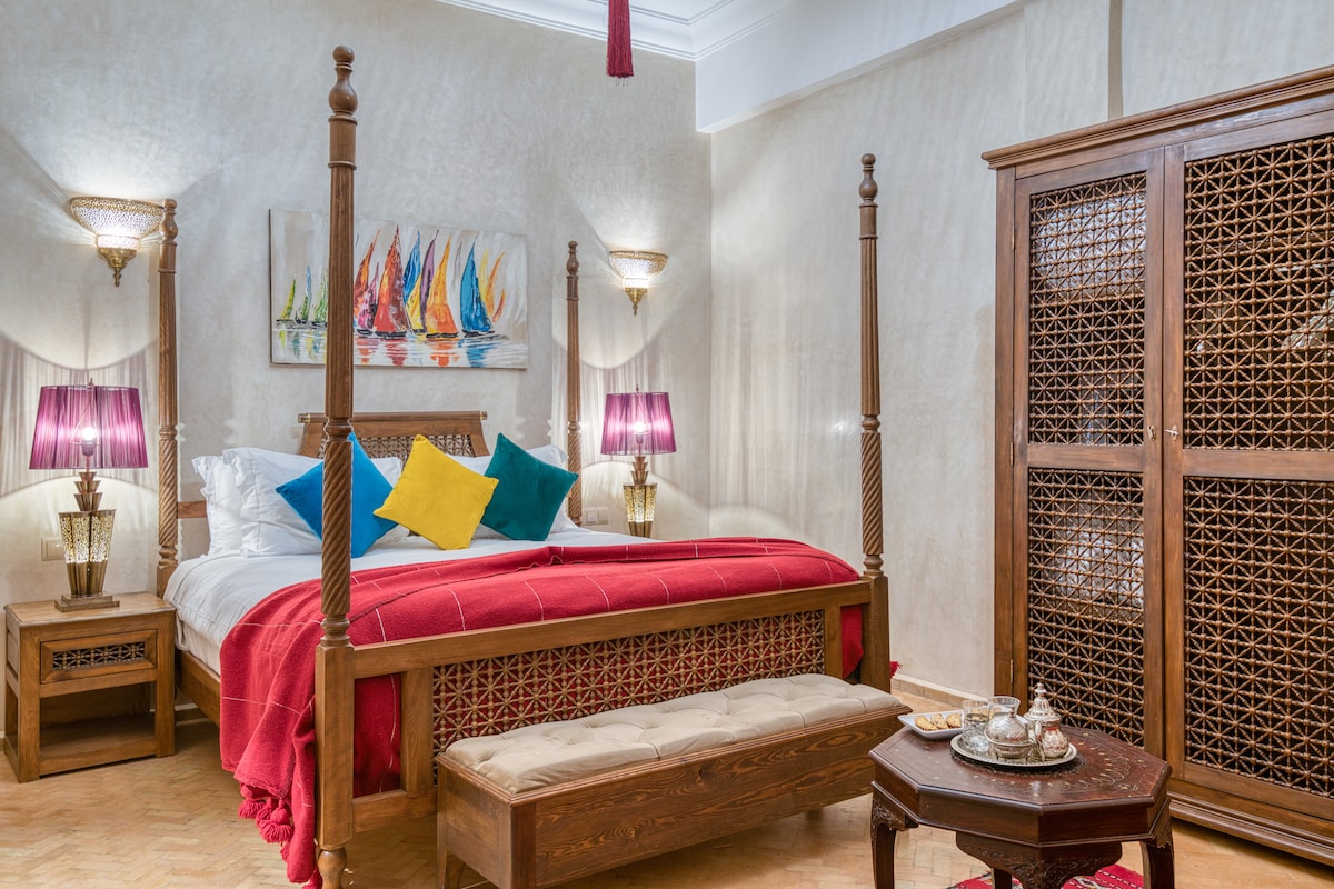 Superior canopy bed suite of 26 sqm air-conditioned or heated, romantic decoration. Double queen size bed 160 or twin beds (to be specified when booking), sitting area, private bathroom bath or shower and toilets. Breakfast included. Excluding city tax 2,8€/person/night to be paid at the riad before check out.