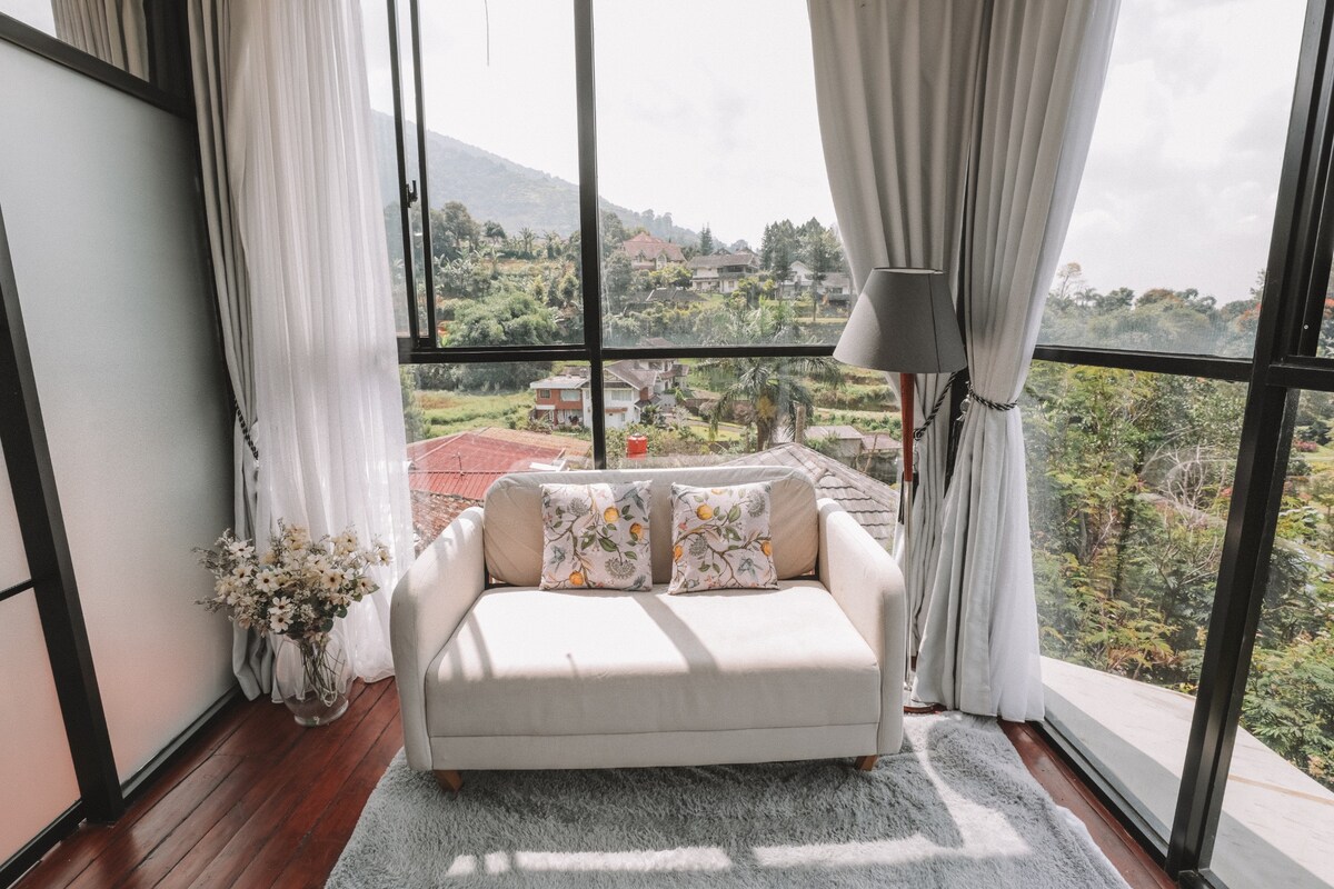 This secluded mountain villa offers a peaceful escape from Jakarta. It comfortably fits 4 guests in 2 bedrooms, with extra space in the semi-open living room for 2 more. The open design brings you closer to nature, with fresh air and a stunning view of Mt. Salak on clear days. Perfect for a quiet retreat or quality time with loved ones in a serene, natural setting.
