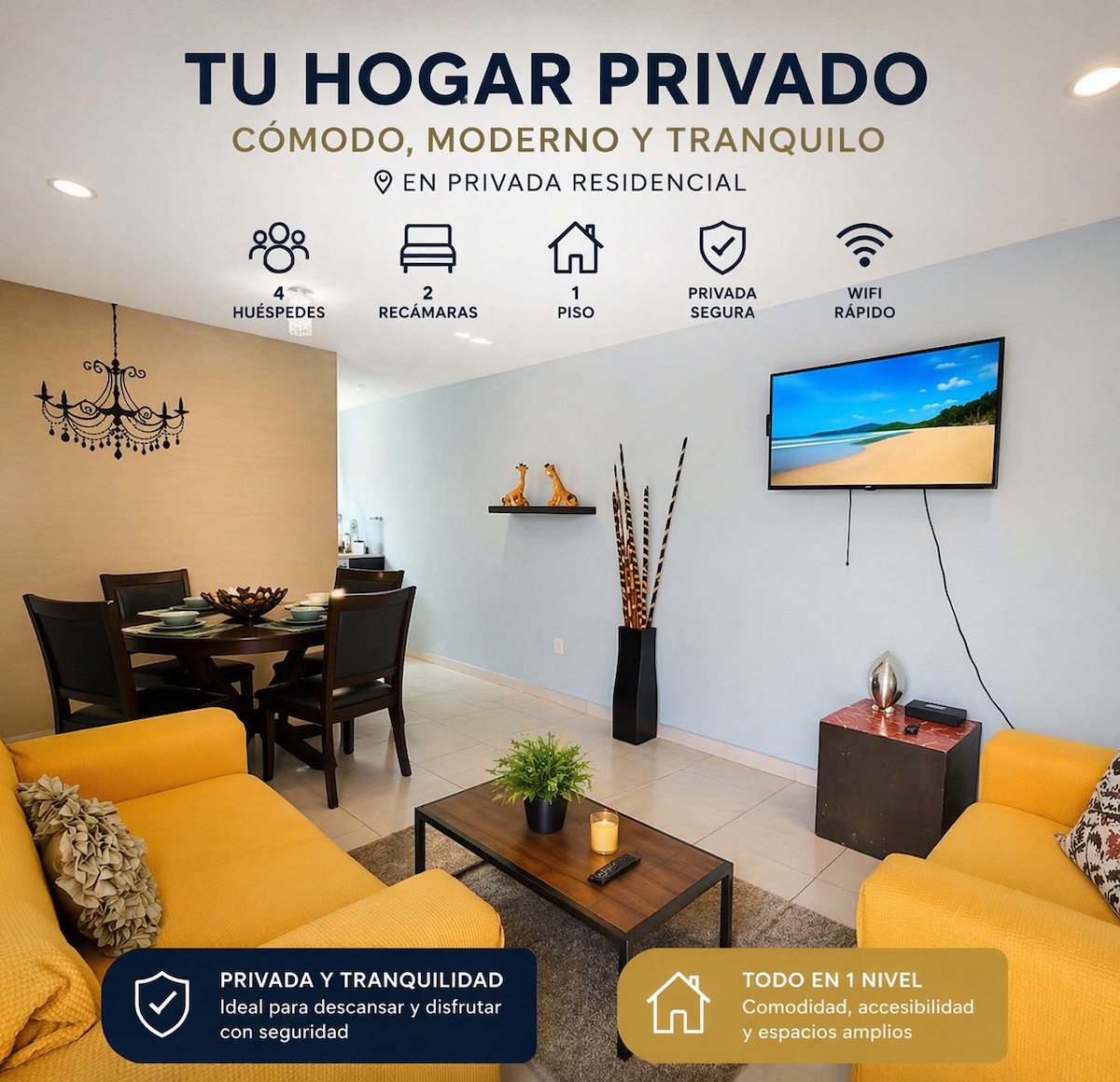 Această locuință unică are o mulțime de spațiu pentru a te bucura cu a ta, poate fi adaptată pentru mai multe persoane, dacă doresc, are spații diferite în aer liber, precum și o zonă de joacă sau diferite activități de divertisment, o priveliște frumoasă și de ce nu, chiar și unde să ai o cină romantică sau un mic dejun de familie. Ne aflăm într-o subdiviziune securizată, cu supraveghere non-stop, o piață în apropiere și multe activități.