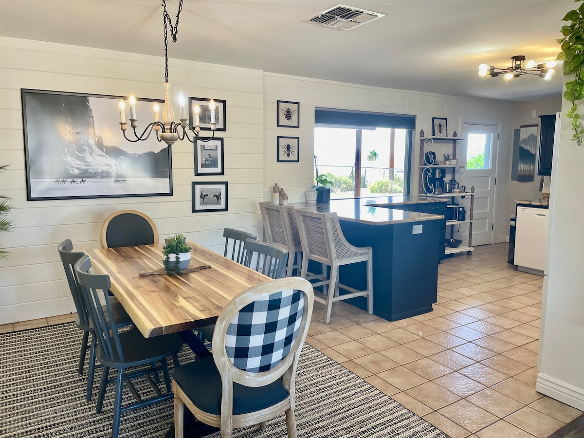 Clean, modern & spacious retreat to relax that's only 8 minutes from Horseshoe Bend & 11 minutes from Antelope Canyon. Come & enjoy the luxuries of home & unwind in our curated space in-between your desert & lake adventures. Grill & sit around the fire pit at sunset, enjoy desert views & gaze at the stars before heading inside to watch a 75” HDTV, play arcade games, foosball, or table tennis. 3 minutes drive to supermarkets & all of the main restaurants downtown. Fast WiFi, washer/dryer, parking