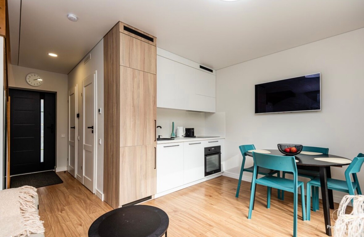 Apartament nou, elegant, în complexul privat „Mano jūra 2”, cu piscină încălzită, jacuzzi, zone de grătar, saună în exterior. Marea Baltică se află la 900 de metri de mers pe jos de apartament. Restaurantul cu fructe de mare se află la 400 de metri în afara proprietății. Studioul are loc de parcare privat. Balconul are vedere la piscină!