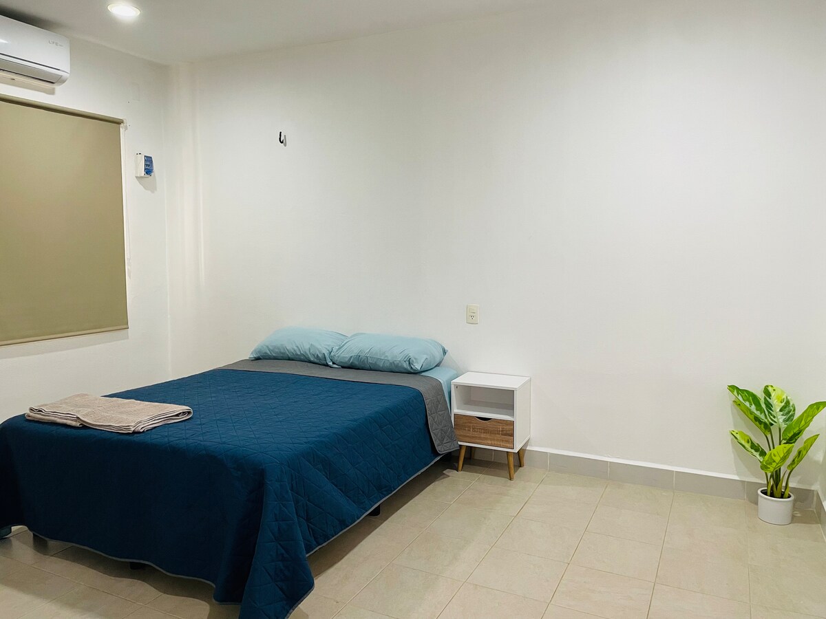 Din această unitate de cazare centrală și spațioasă, puteți avea acces ușor la tot, în fața apartamentului există un OXXO și pe jos veți găsi farmacii, restaurant, cafenele,brutării, magazine, meșteșuguri, bancă, bucătărie economică, pizzerie etc. Anunțul are: (1)Cameră cu 1 pat matrimonial, 1 baie,aer condiționat și TV 1 saltea pneumatică completă (1)Dormitor 1 pat matrimonial, aer condiționat și TV Living-sufragerie-bucătărie Terasă pe acoperiș și zonă de spălătorie