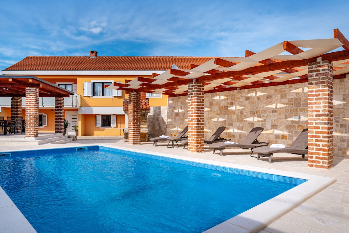 . Această vilă recent renovată se află într-o locație liniștită, în centrul orașului Nin, aproape de plajă, restaurante și supermarketuri. Casa este formată din trei dormitoare, un living cu o sală de mese, o bucătărie complet utilată, o bucătărie de vară cu toaletă, o terasă și o piscină privată. Toate camerele sunt dotate cu aer condiționat, iar o cameră are o baie privată. Oaspeții noștri au parcare privată, WiFi și grătar. Familia noastră îți dorește o ședere plăcută.