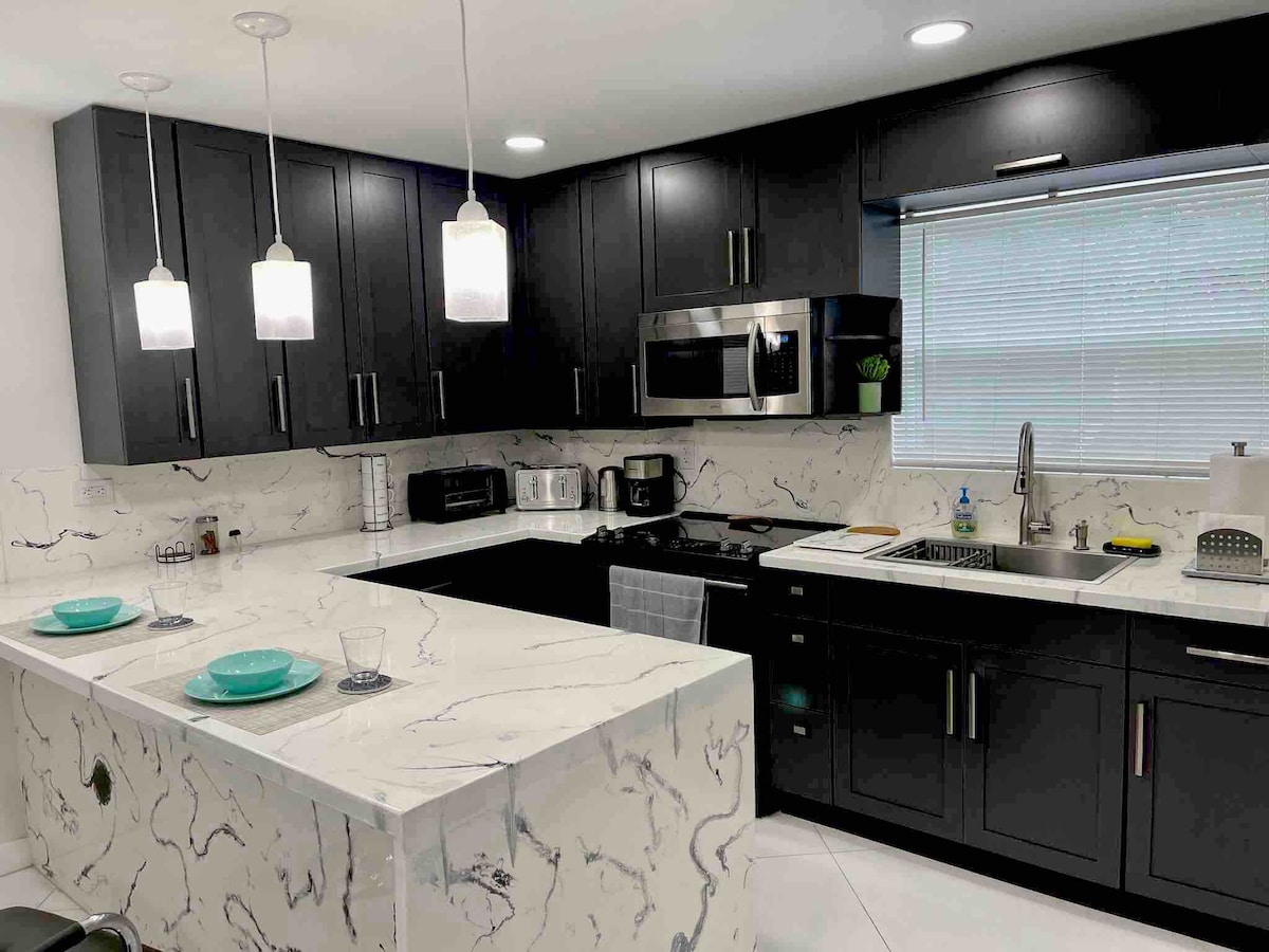 Bine ați venit la casa noastră de sine stătătoare, recent renovată, cu mobilier modern, aparate de ultimă generație și dotări de lux. Relaxează-te în living-ul spațios, gătește o masă gastronomică în bucătăria complet utilată sau relaxează-te pe terasa mare cu mobilier confortabil de exterior. O să-ți placă dușul cu jet de masaj, patul matrimonial moale și locația liniștită. Bucură-te de o intrare privată, două locuri de parcare dedicate și TV inteligent de 65". Rezervă acum pentru o ședere convenabilă și luxoasă în West Palm Beach.