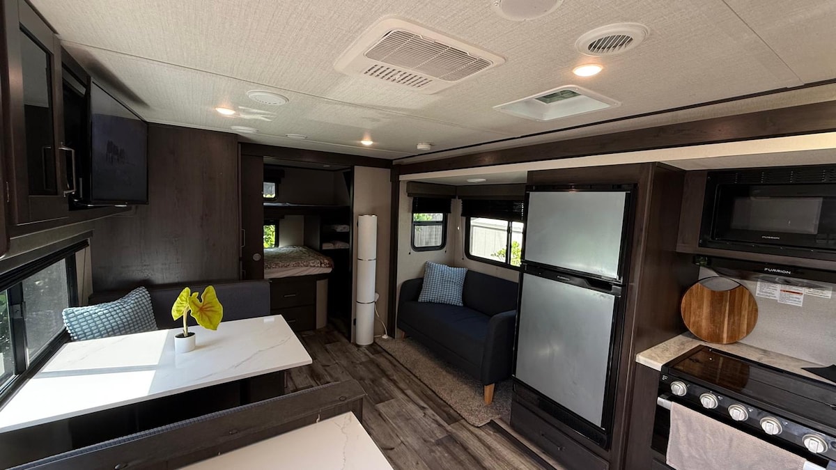 Well appointed RV with private queen bedroom, plus double bunk beds. Features 2 bathrooms including 1 with a full shower which is very rare in a rental RV! Our guests have access to semi-private saltwater pool and hot tub on our property. Camper is fully hooked up with electric, water, and sewer. *Note: We also have a 2nd separate RV pad next to our AirBnB RV that we rent out through HipCamp that may be occupied during your stay.