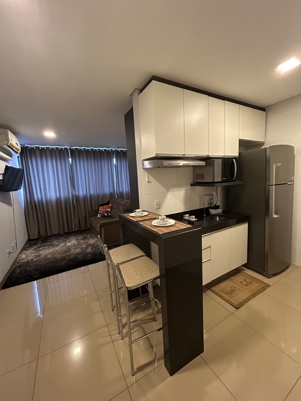Spațios, confortabil și bine situat în Centro de Palmas. Apartament mobilat cu un dormitor spațios (pat dublu + canapea extensibilă), aer condiționat și TV inteligent. Baie cu duș electronic, prosoape, săpun și șampon. Bucătărie completă cu frigider, aragaz, cuptor cu microunde, friteuză și cafetieră Nespresso. O terasă privată plăcută și un cadru funcțional pentru șederi de agrement sau de afaceri. Restaurant în apropiere și acces ușor la principalele puncte ale orașului. Ideal pentru cupluri sau profesioniști aflați în deplasare.