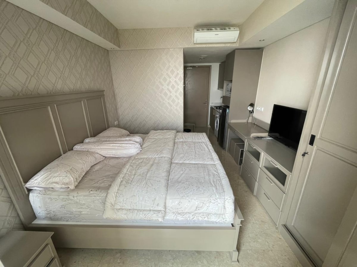 Studio confortabil la Maplepark Apartment lângă JIEXPO, zona Ancol și Sunter, bucură-te de internetul nostru de mare viteză de până la 150 Mbps, televizor inteligent cu Netflix gratuit, cuptor cu microunde, duș cu apă caldă și dozator de apă potabilă, oferim, de asemenea, masă de lucru cu scaun de birou. Mâncarea/alimentele din apropiere sunt disponibile în minimartul și cantina din hol. De asemenea, bucură-te de procedura noastră flexibilă de check-in/check-out.