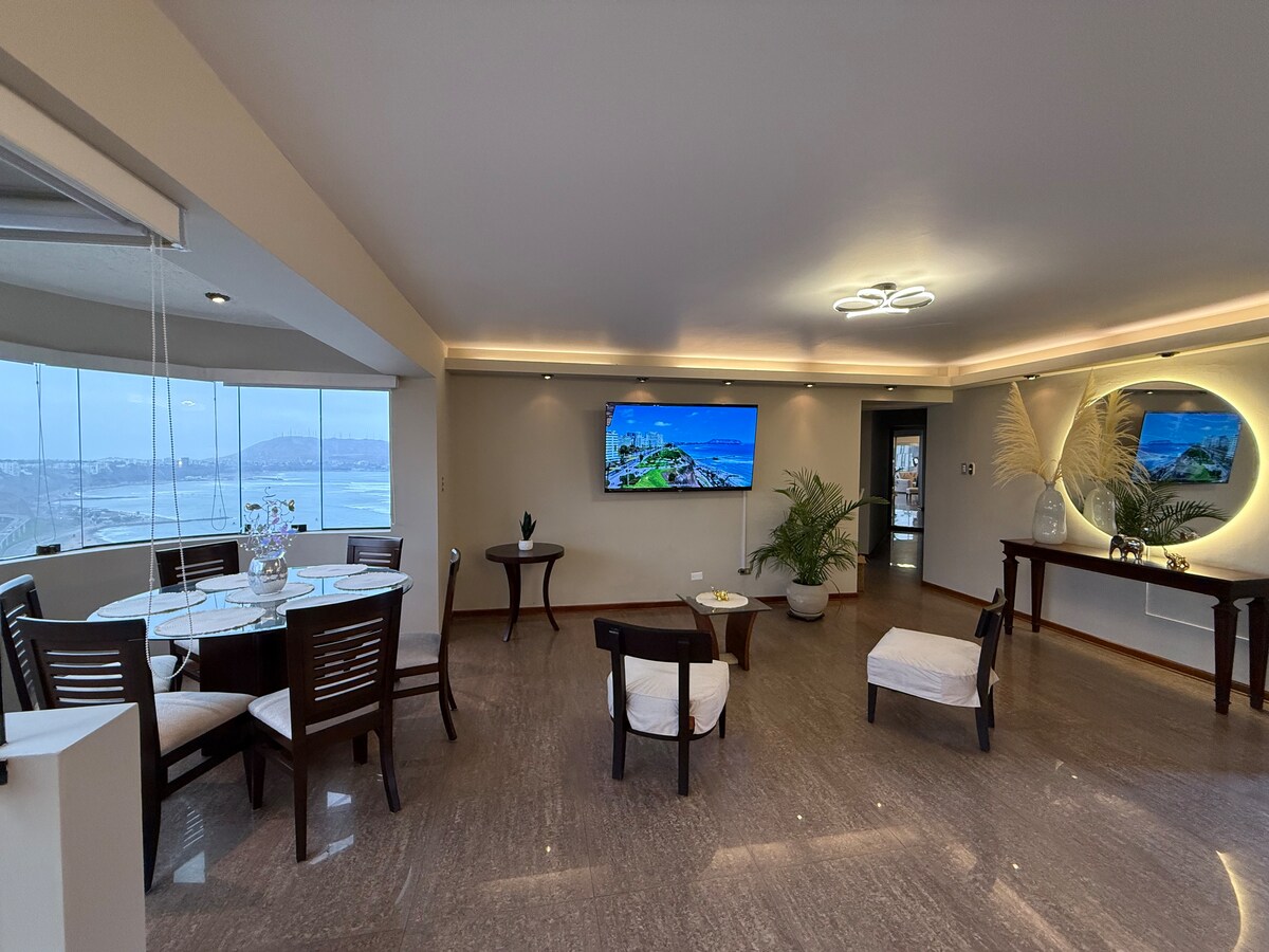 El Departamento esta ubicado cerca al aeropuerto y a 15 minutos de Miraflores por el circuito de playas ,puedes disfrutar de una vista al mar desde todos los ambientes ,contamos con servicio de transporte y tenemos soporte al huespede 24/7. . El departamento está totalmente equipado , agua caliente de alta velocidad, Wifi , 2 TVs de 55’ y cuenta con una piscina panorámica en el ultimo piso , así como sauna y gimnasio .