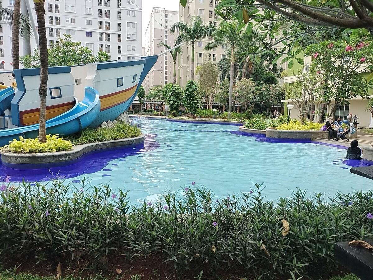 Studio confortabil la Maplepark Apartment lângă JIEXPO, zona Ancol și Sunter, bucură-te de internetul nostru de mare viteză de până la 150 Mbps, televizor inteligent cu Netflix gratuit, cuptor cu microunde, duș cu apă caldă și dozator de apă potabilă, oferim, de asemenea, masă de lucru cu scaun de birou. Mâncarea/alimentele din apropiere sunt disponibile în minimartul și cantina din hol. De asemenea, bucură-te de procedura noastră flexibilă de check-in/check-out.