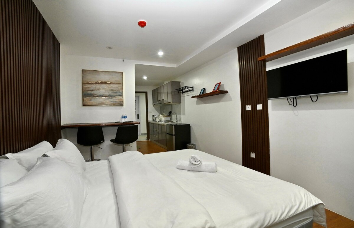 Experience lavishness in each and every corner of this air-conditioned modern and luxurious BrandNew Centrally located Condo unit. Enjoy an incredible and relaxing experience w/ full double-size bed topped with Ikea Duvet covers. Sit back in 2-seater sofa bed while watching your favorite NETFLIX series in 40 Inches TV. Complete cooking and dining utensils. Spacious study area for WFH needs w/ Fiber Internet speed up to 80MBPS.Clean and fragrant T&B w/ hot and cold shower.