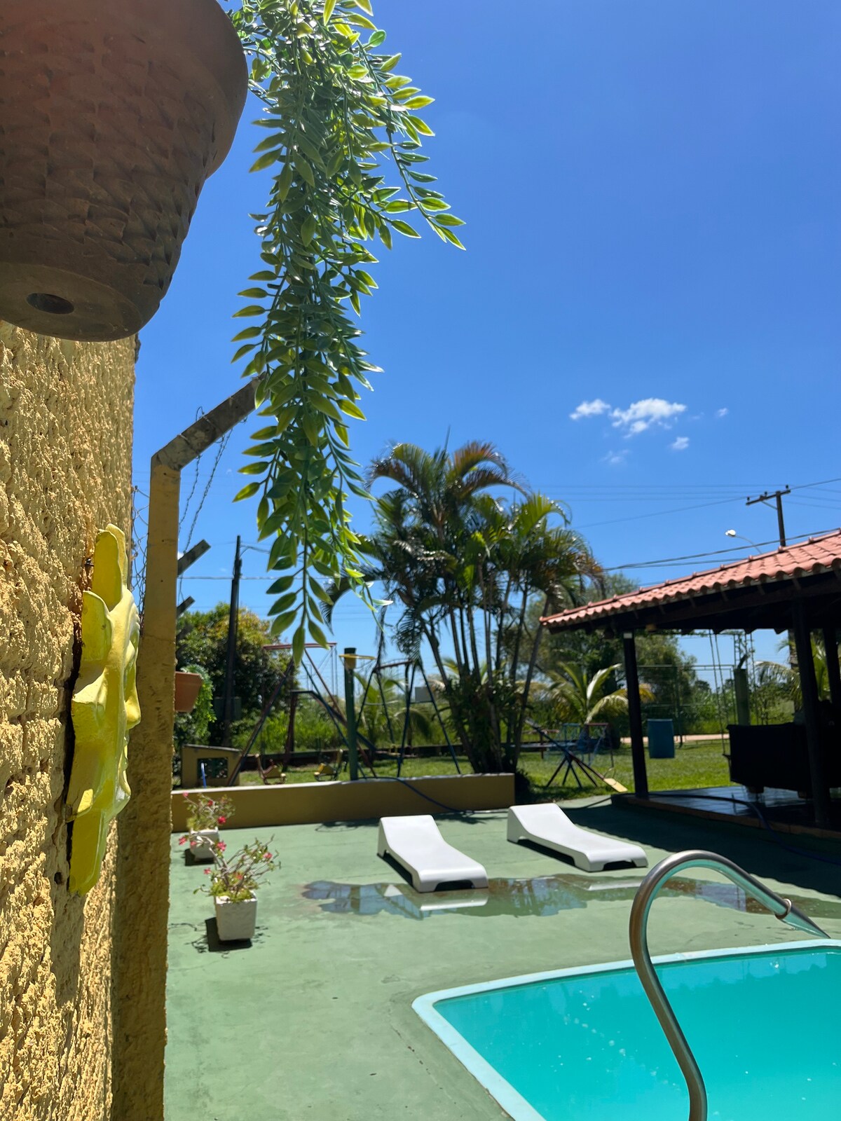 Fermă simplă, dar curată și sigură, ideală pentru familiile cărora le place să se plimbe pe râu și să pescuiască! Poate găzdui mai mult de 22 de persoane în paturi și are cu 10 saltele și spațiu pentru saltele pe podea! Băi separate pentru femei și bărbați. Bucătărie cu ustensile de uz casnic complete, congelator, frigider și aragaz. Perete împrejmuit cu gard electric, poartă electronică și spațiu pentru depozitarea mașinilor. Nu avem lenjerie de pat și de baie. Te interesează João, telefonic în galeria foto.