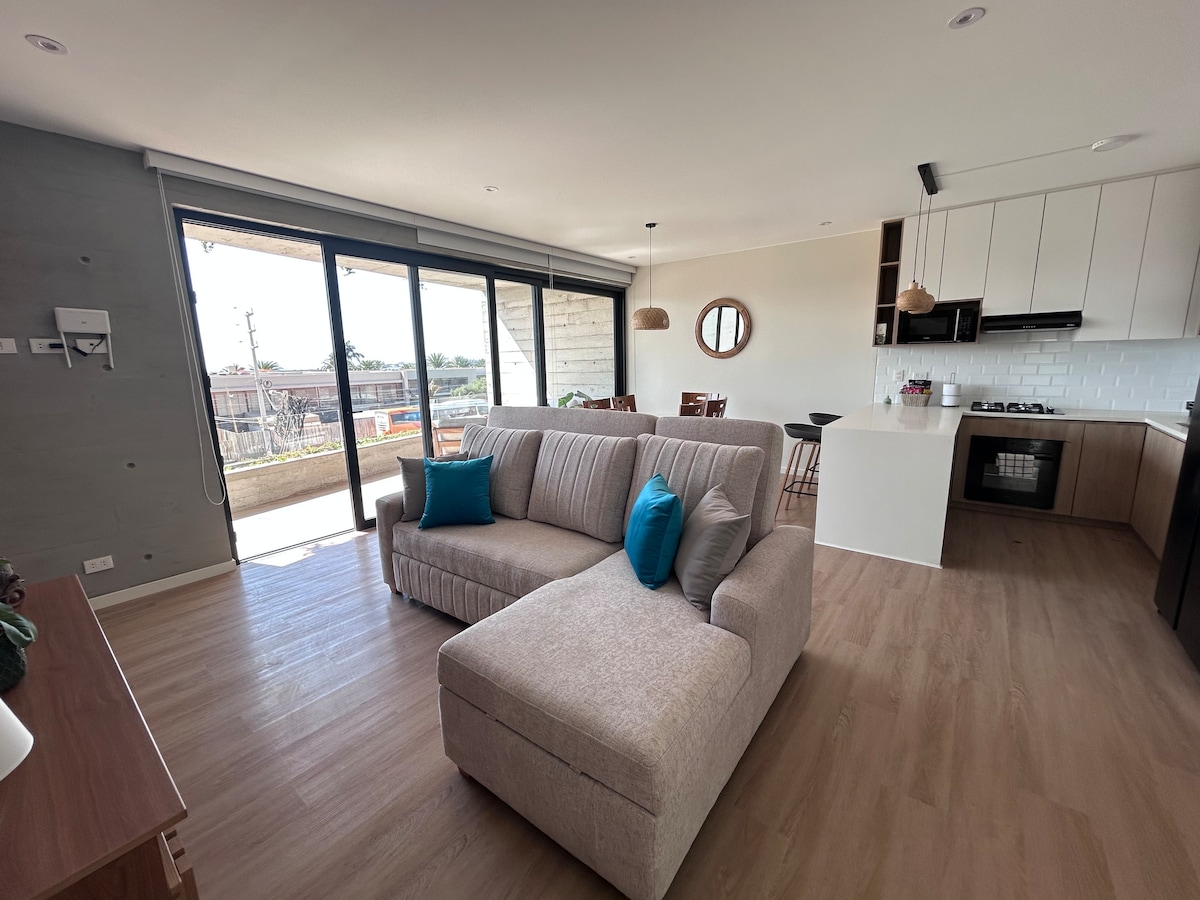 Situat în frumosul și modernul Condominio Navigare Paracas, acest apartament exclusivist este perfect pentru persoane singure și cupluri, oferind vedere uimitoare la ocean și apropierea de Rezervația Paracas. Ideal pentru kitesurferi, iubitori de fitness și lucrători la distanță. Creat elegant de un designer peruvian, are o bucătărie complet utilată, pat matrimonial și grătar. La doar 5 minute de Kite Point și la 1 km de Parcul Național. Bucură-te de coworking și sală de gimnastică la fața locului. Fă-ți escapada de neuitat!
