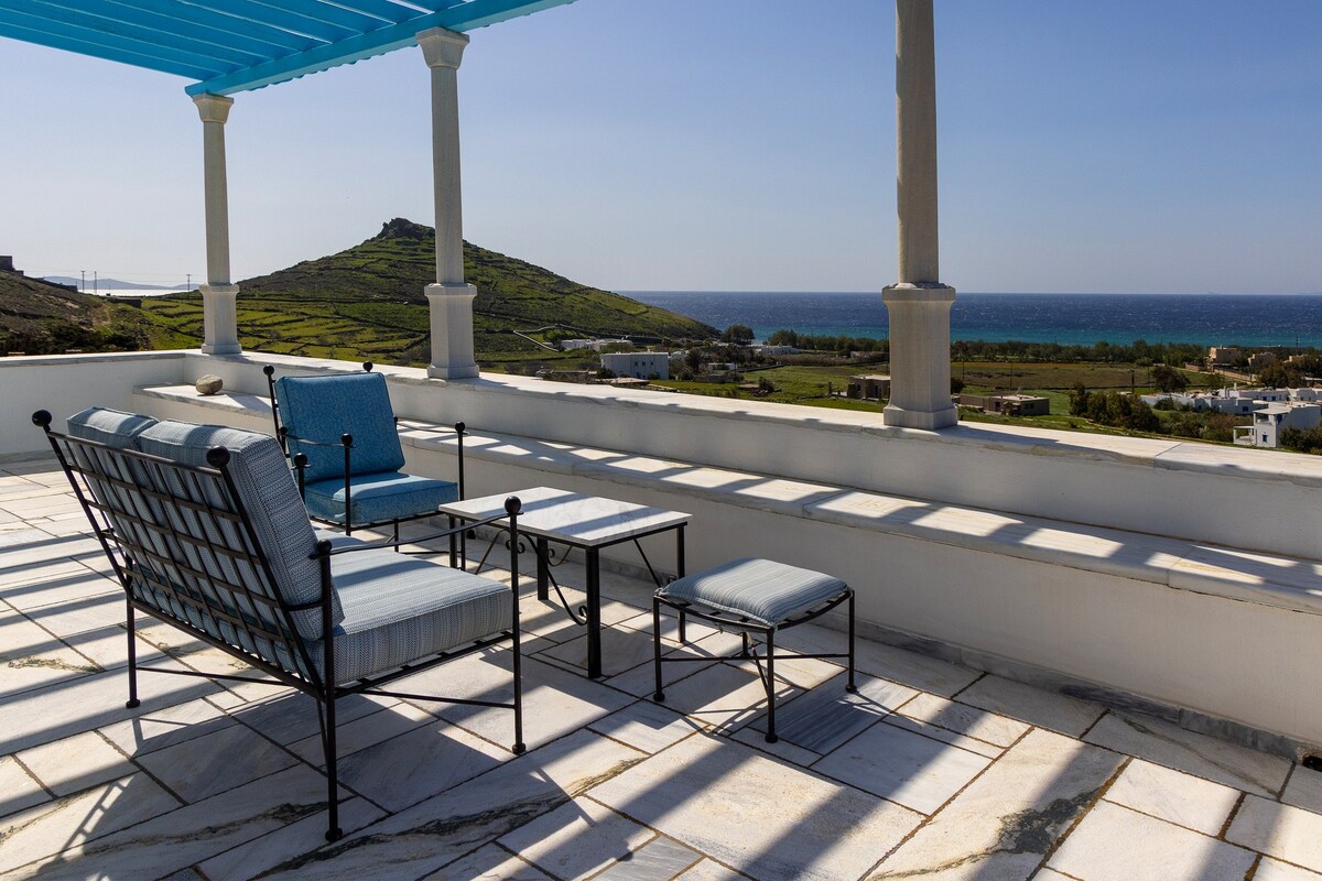 Marble Majesty cu trei etaje este o reședință de 157 mp din cadrul complexului Villa Marble, oferind un amestec elegant de arhitectură cicladică și confort modern. Interioarele sale spațioase și balcoanele grandioase oferă priveliști uluitoare ale golfului, ceea ce îl face un refugiu ideal pentru cei care apreciază stilul și liniștea. Amplasat printre plantațiile de măslini, asigură intimitatea, permițând în același timp acces ușor la plaja Agios Fokas și centrul orașului, combinând liniștea cu confortul pentru o ședere cu adevărat luxoasă pe insulă.