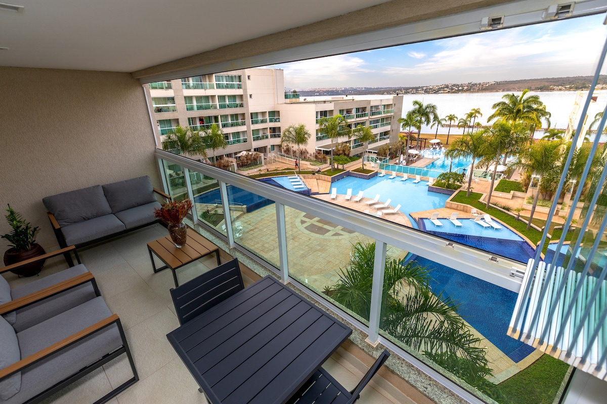 Flat à beira do Lago Paranoá no Condomínio Lake View Resort, próximo a Esplanada dos Ministérios. Espaço comum com estacionamento, área de lazer com piscinas, sauna, hidromassagem, área de massagem, academia, pier, espaço gourmet, loja de conveniência, espaço de trabalho, e acesso a internet. O check-in é feito na recepção do Resort 24 horas.