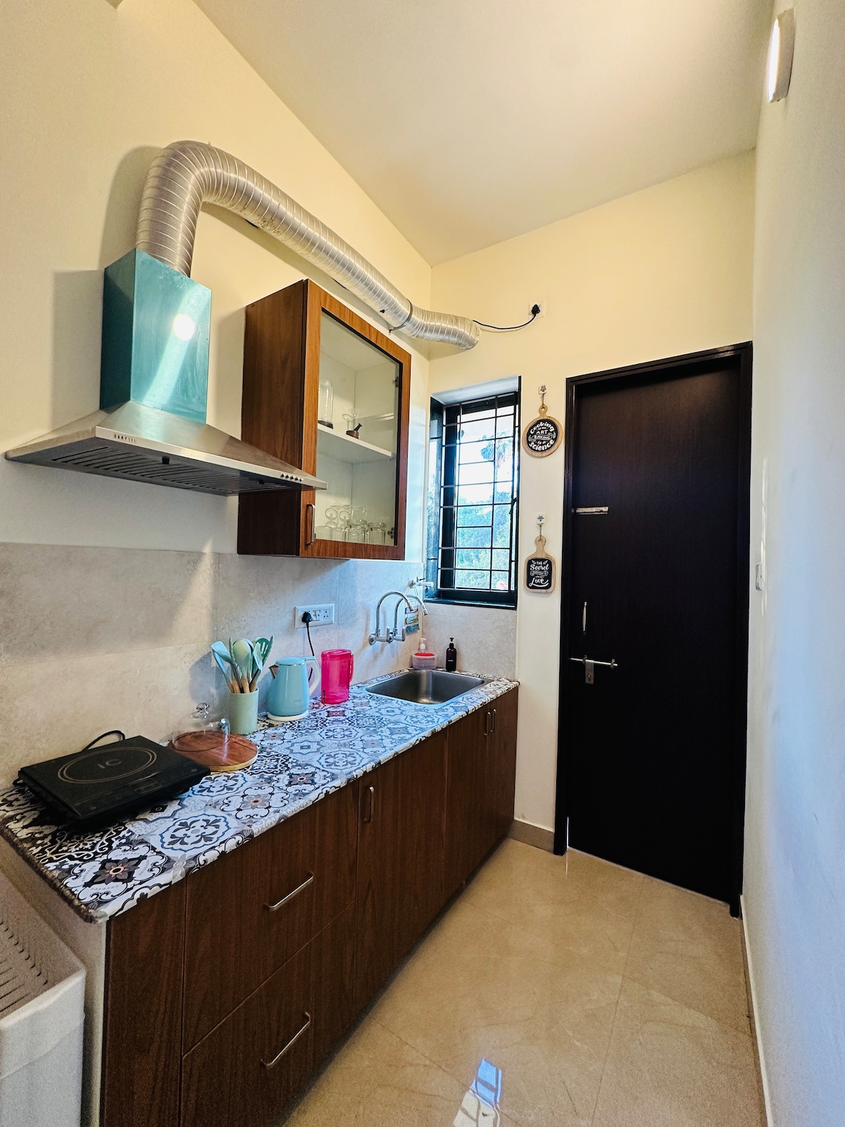 This homestay is for those who have time and want to enjoy a slow life, experience spacious living, and relax in the rooftop garden with a hot tub within walking distance of the beach. This 2BHK home is on the 1st floor and equipped with modern facilities. Each bedroom has attached private bathroom access. Bedroom 1 has a bathtub while Bedroom 2 has a a spacious shower area. Bedroom 2 has more storage capacity, a dedicated workspace and access to a balcony, accessible via the living room also.