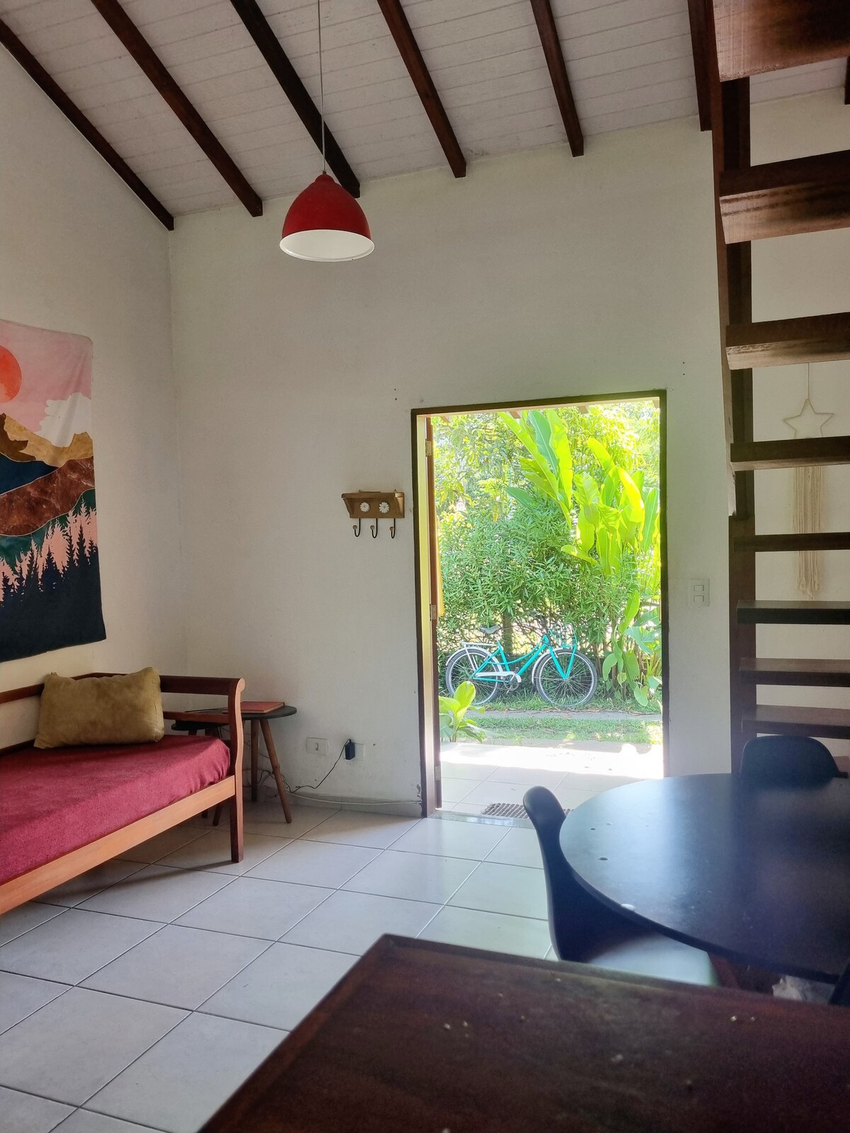 Cabană situată pe o stradă liniștită, în Bairro Caborê, într-un apartament în complex rezidențial închis și securizat. Aproape de plajă și la 1,5 km de centrul istoric al orașului Paraty și de piața cartierului. Casă dotată cu toate articolele de uz casnic pentru o ședere confortabilă. Dormitor la mezanin cu pat dublu și baie, pat single în living și baie la parter. Balcon cu hamac în fața casei și curte mică în spate.