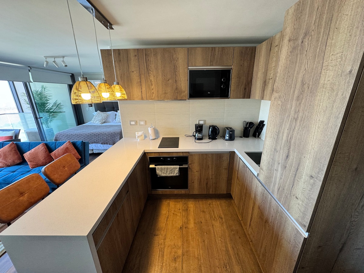 Studio, modern design, ThermoPanel for acoustic and thermal insulation, A/C. Located in the top-rated area in Santiago. Steps away from Tobalaba Metro station, from best restaurants in Santiago, from Costanera Center Mall, cafes and a supermarket. Excellent wifi, free of gas appliances, Cable TV, Smart TV 55" curved screen, nice bathroom. All in a safe neighborhood with many services. For security reasons, it is required to send us, after booking, photos of ID and selfie of each guest.