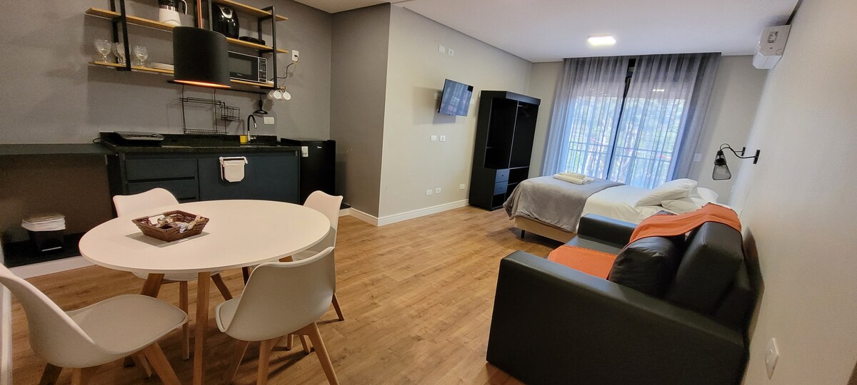 Espaço moderno e bem próximo do centrinho turístico de Campos do Jordão, equipado com mine cozinha para lanches e até pequenas refeições diárias, estamos a apenas 700 metros da centrinho da Vila Capivari, sendo possível ir caminhando, na parte inferior do prédio tem um charmoso restaurante (Moringa) com deliciosas opções de pratos, eles também servem café da manhã.
