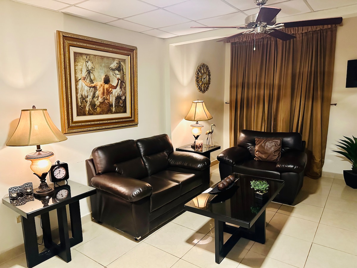 Bine ai venit în paradisul tău: El Salvador. San Salvador combină stilul modern, farmecul istoric și frumusețea naturală. Apartamentul nostru, situat în Turnul Panorama, Colonia Escalón, găzduiește până la 5 oaspeți. Are două dormitoare cu aer condiționat, un living confortabil, o bucătărie complet utilată, o zonă de spălătorie și o curte pavată relaxantă. Oaspeții se bucură de acces la dotări exclusive, cum ar fi o piscină pe acoperiș, sală de gimnastică, parcare privată, loc de joacă pentru copii și securitate non-stop, asigurând un sejur sigur și plăcut.