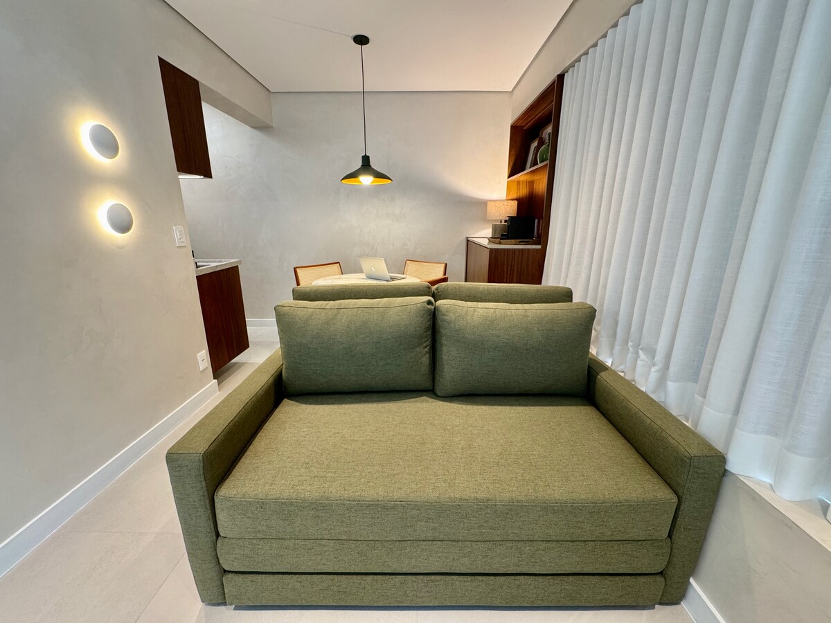 Studio tip boutique cu una dintre cele mai frumoase priveliști ale orașului São Paulo. Situat la 2 minute de mers pe jos de metrou. Bucătărie complet utilată, cu frigider ascuns de ușa din lemn. Wi-Fi, aer condiționat și TV inteligent de 55 inch. Check-in independent cu blocare electronică inteligentă. Joacă tenis sau mergi la sală de gimnastică și relaxează-te în piscine (în aer liber sau în interior încălzit) și saune (umede sau uscate) după aceea. Zona comună include, de asemenea, spații de co-working și spălătorie. Vizitatorii trebuie să fie înregistrați anterior în partea din față.