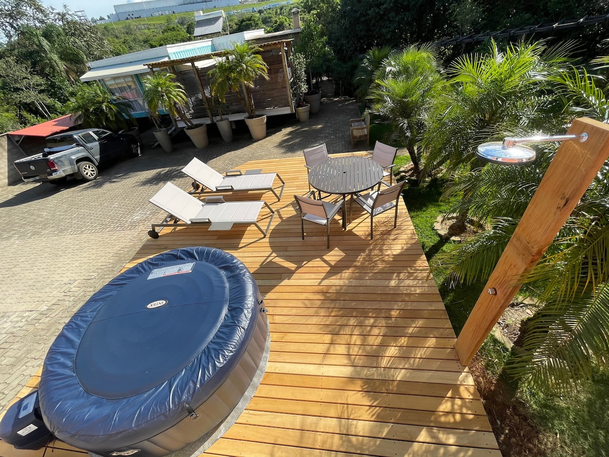 Vino și stai într-o cabană din lemn de peste 1200 m înălțime, situată în fermecătorul oraș Poços de Caldas, în mijlocul munților din sudul Minas Gerais. Cabana are o cadă cu hidromasaj, aer condiționat (rece și cald), pat matrimonial într-un acvariu de sticlă, terasă cu vedere la munți și un apus de soare de neuitat, precum și o zonă în aer liber cu gazon de o mie de metri, șemineu de grădină, o perlă romantică de picnic și fotografii de neuitat, cu dragostea și animalul tău de companie !