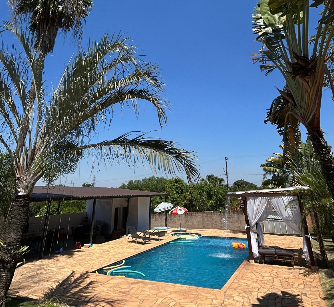 Chácara grande com piscina de 50 metros quadrados, churrasqueira, 2 quartos e 2 banheiros. Dentro de condomínio residencial. Permitido festa sem som alto. Liberação mediante a foto do RG/CNH de todos + foto do documento dos carros. Por favor leiam a descrição completa. Podemos combinar melhor o horário de entrada e saída sem problemas.