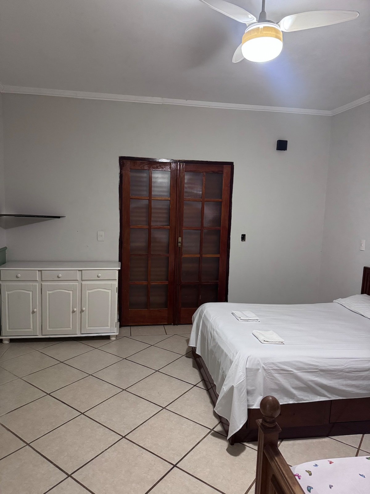 Confortável suíte com cama queen, ar condicionado, ventilador de teto, enxoval completo, banheiro privativo, frigobar, armário, estação de trabalho, wi-fi, TV aberta, silêncio e tranquilidade ideais para trabalho, estudo e descanso.