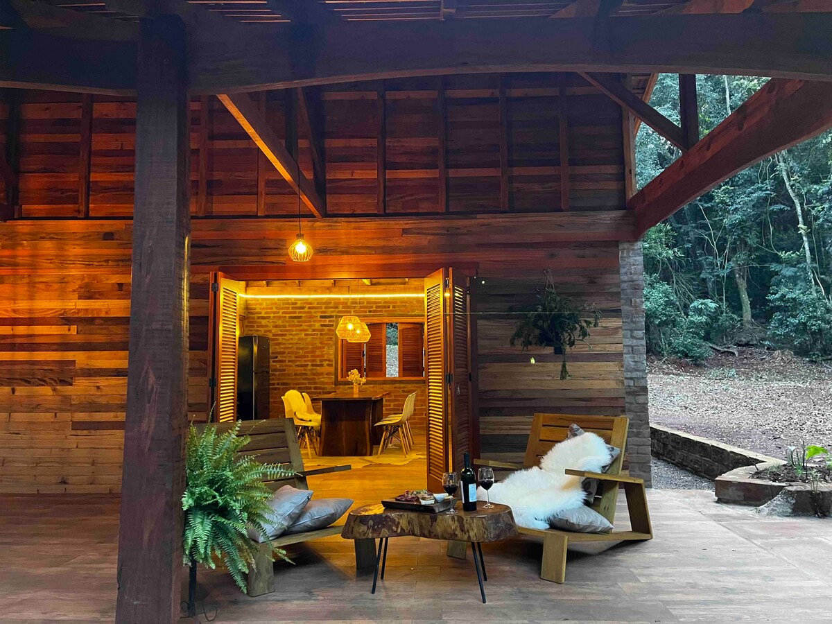Uma cabana A frame imersa na mata nativa e nos parreirais de uma família de origem italiana. Projetada para acordar com o som dos pássaros e dormir com o barulho da água. O ponto alto fica logo na chegada, o deck fica em cima de uma cachoeira. A cozinha é completa com utensílios de ótima qualidade. O banheiro tem vista para a mata, banheira de imersão e amenities L'Occitane. Todos os cômodos são decorados nos mínimos detalhes. Ideal para relaxar e se colocar no compasso certo da vida.