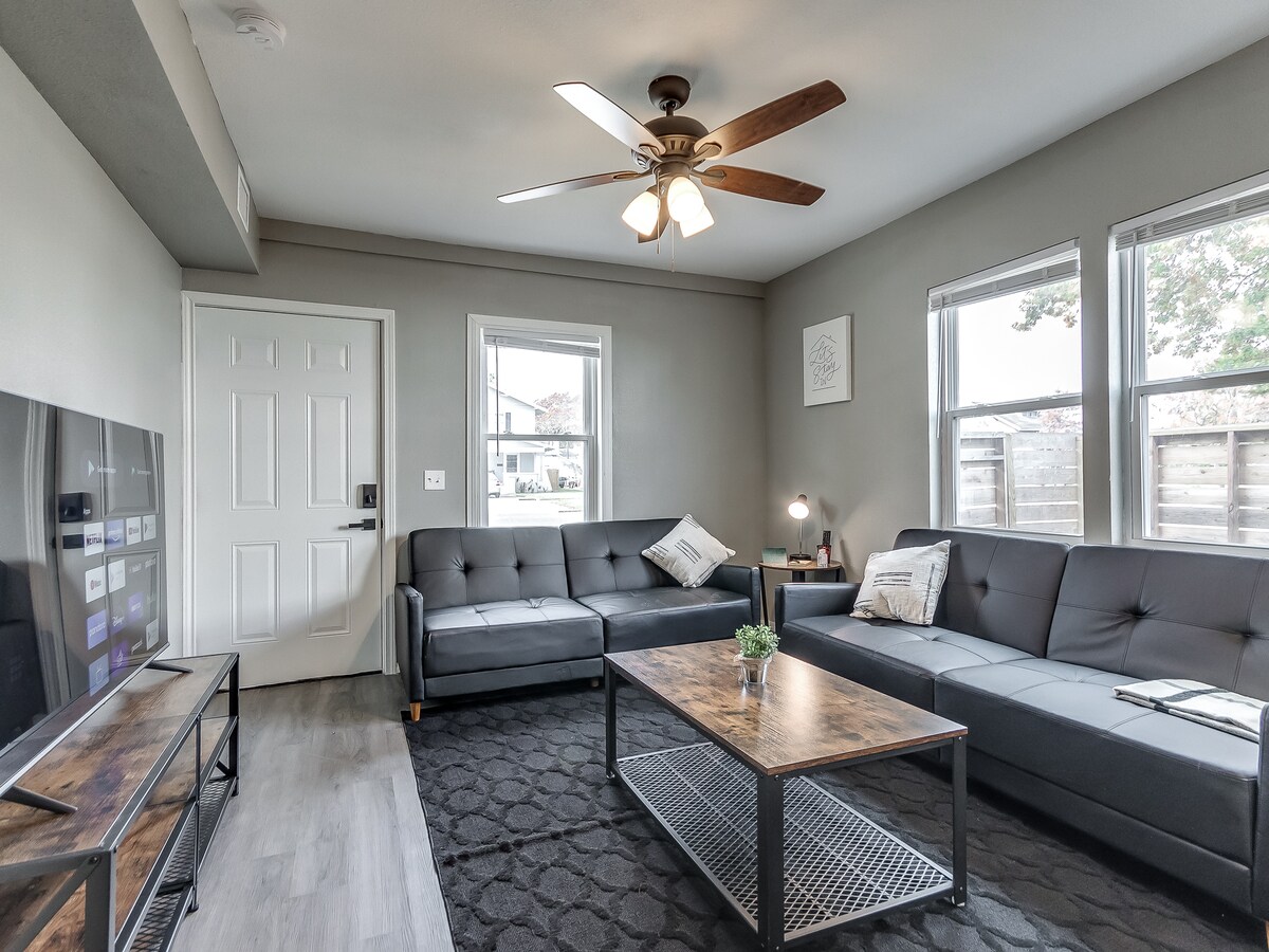 Relaxează-te în acest apartament elegant, proaspăt renovat din centrul orașului, în inima orașului Bartlesville. Indiferent dacă vizitezi în interes de serviciu sau te distrezi, bucură-te de confortul unui living modern, dotat cu o bucătărie completă, TV inteligent și mașină de spălat/uscător în unitate. Distanță de mers pe jos până la magazinele, restaurantele și locurile culturale locale!