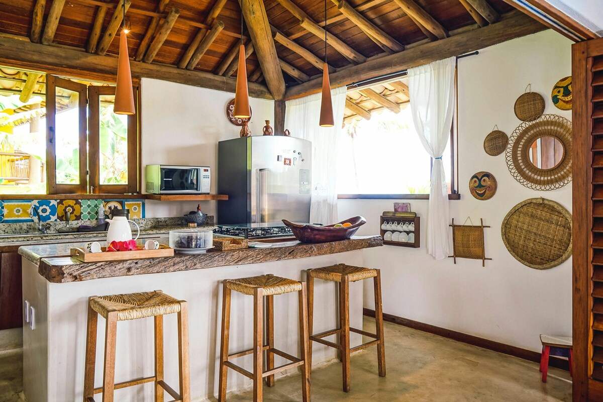 Sinta-se abraçado pela natureza em nosso refúgio no Alto da Mata. A varanda, com sua churrasqueira e mesa ao ar livre, é seu camarote exclusivo para o espetáculo diário do pôr do sol sobre a copa das árvores. O conceito aberto cria um ambiente único e integrado, perfeito para criar memórias em um cenário de tirar o fôlego, a poucos minutos do centro de Itacaré.