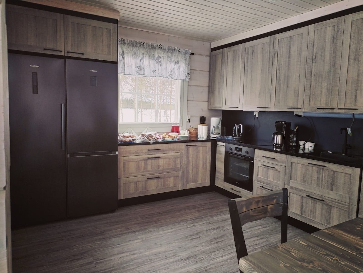 Bine ai venit în mijlocul naturii pentru a te bucura de atmosfera confortabilă a unei cabane din bușteni. Această casă de vacanță, construită în 2013, este situată la doar aproximativ 30 de minute de mers cu mașina de centrul orașului Rovaniemi și de satul Moș Crăciun. Cabana are două dormitoare, un living, o bucătărie, un șemineu și o saună cu lemne, unde poți experimenta cultura saunei finlandeze. Există, de asemenea, un spațiu privat (laavu) în incintă.