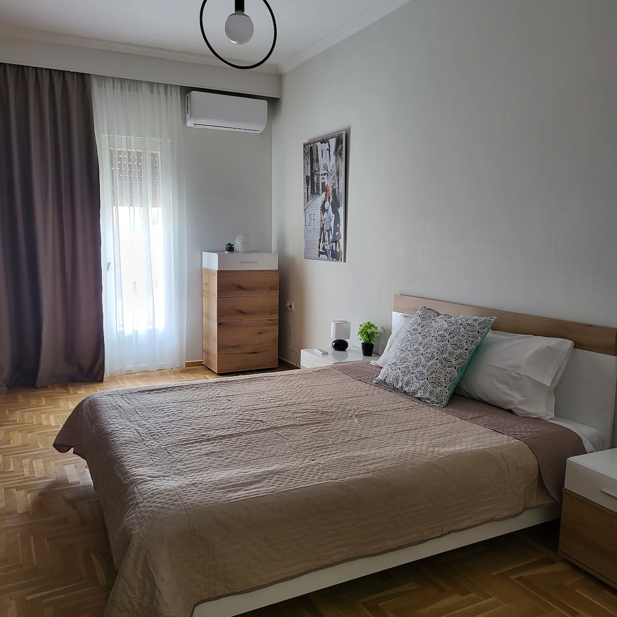 A 2024 fully renovated 2BDR place ideally located in downtown Veria. Perfect for long-term stays. Tucked between Barbouta, the old Jewish Quarter and the traditional Kyriotissa Quarter. The large pedestrianized area bustling with cafes, bars, restaurants and shops, the Gates Foundation awarded Public Library, Elia Park, Apostle Paul's Podium are couple of minutes away. Marvel at the Old Cathedral opposite us. A super market, pharmacy, gym and 24h open kiosks are nearby. Flexible check-in/out.