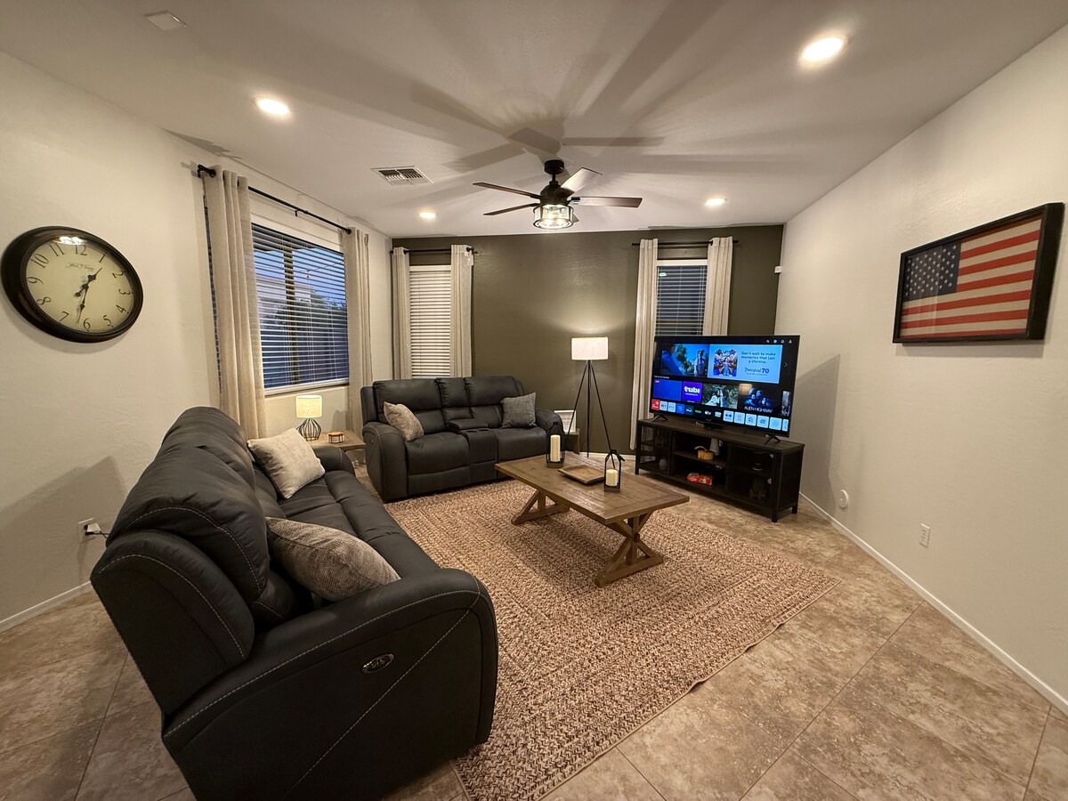 Adu întreaga familie în acest loc minunat cu mult spațiu pentru distracție. Oferim o proprietate spațioasă și privată, cu o curte mare în spate, camere cu patru paturi, două băi, un living, sufragerie, bucătărie completă și sală de jocuri. Bucură-te de jocuri de golf, cumpărături, mese și jocuri cu mingea de antrenament de primăvară în apropiere. Situat la doar 10 minute de Desert Diamond Casino, Arizona Cardinals State Farm Stadium, Westgate și Tanger Outlets. Locuința se află într-o fundătură prietenoasă. Include garaj pentru 2 mașini și parcare pe alee.