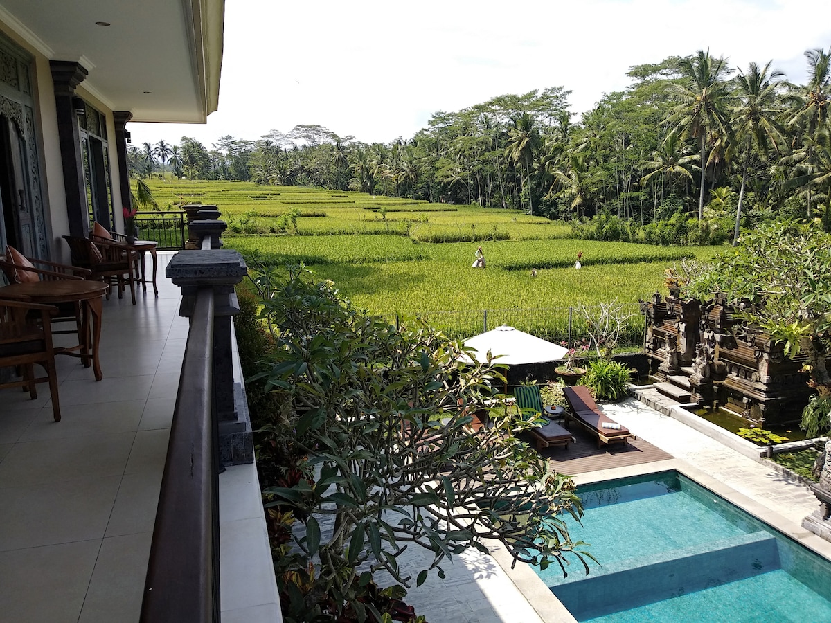 Este un apartament privat la etajul al doilea cu doua dormitoare spatioase cu lumina naturala, living, minibar, bucatarie. Terasă privată mare uimitoare în trei părți, înconjurată de câmp de orez,nuci de cocos și atmosferă tropicală sălbatică. Pat King size ( 2m x 2m ) cu plasă mosqito. Baia are o cadă de baie, duș separat, toaletă cu jet de apă. Prețuim curățenia. Locația este la 3,5 km de centrul Ubud. Partajarea piscină.