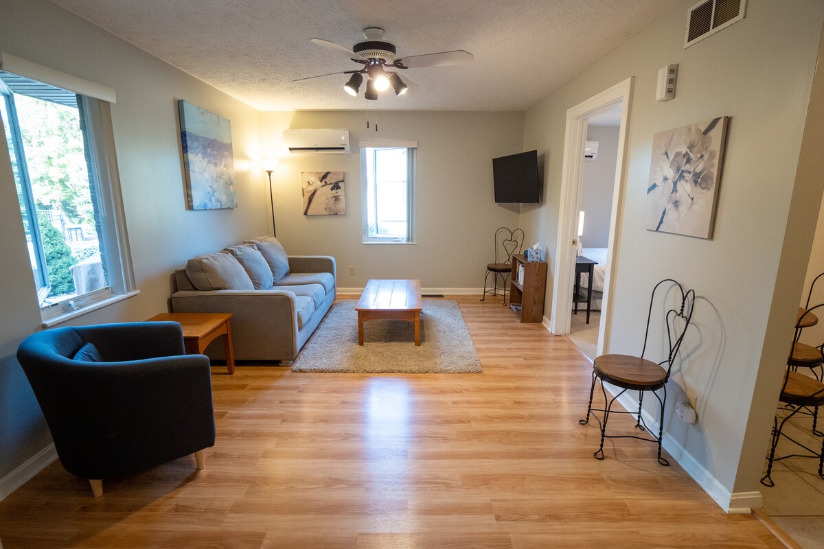 Vino și stai o vreme în acest apartament studio fermecător și unic. Situat în inima istoricului Aurora, IN, poți ajunge pe jos la toate magazinele, parcurile și restaurantele! Ieși pe terasa ta privată și bucură-te de priveliștea râului Ohio! Este evadarea romantică perfectă. De asemenea, suntem prietenoși cu animalele de companie, așa că, dacă doriți să vă aduceți prietenii blănoși, suntem bucuroși să îi găzduim și noi, trebuie doar să fiți conștienți de faptul că există o taxă de 100 $ care acoperă costul nostru suplimentar. Trebuie doar să le adaugi la oaspeții tăi la check-out.