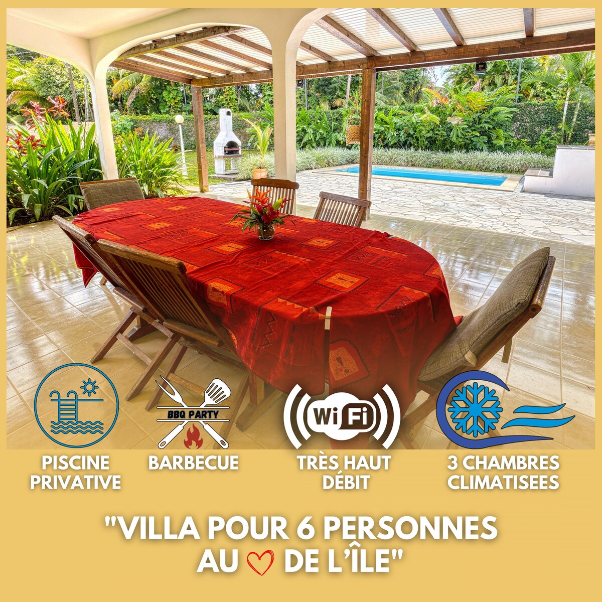 Vrei să te bucuri de un spațiu frumos într-un cadru tropical, în inima Guadelupa? Instalează-te la Villa Tarare, o casă în stil creol înconjurată de natură! Această vilă oferă tot ce îți trebuie pentru o ședere de neuitat și liniștită: spațiu de locuit mare, bucătărie complet utilată, trei dormitoare mari, inclusiv unul pe un singur nivel, terasă dublă și piscină! Toate la poalele munților, la mai puțin de 10 minute de toate facilitățile!