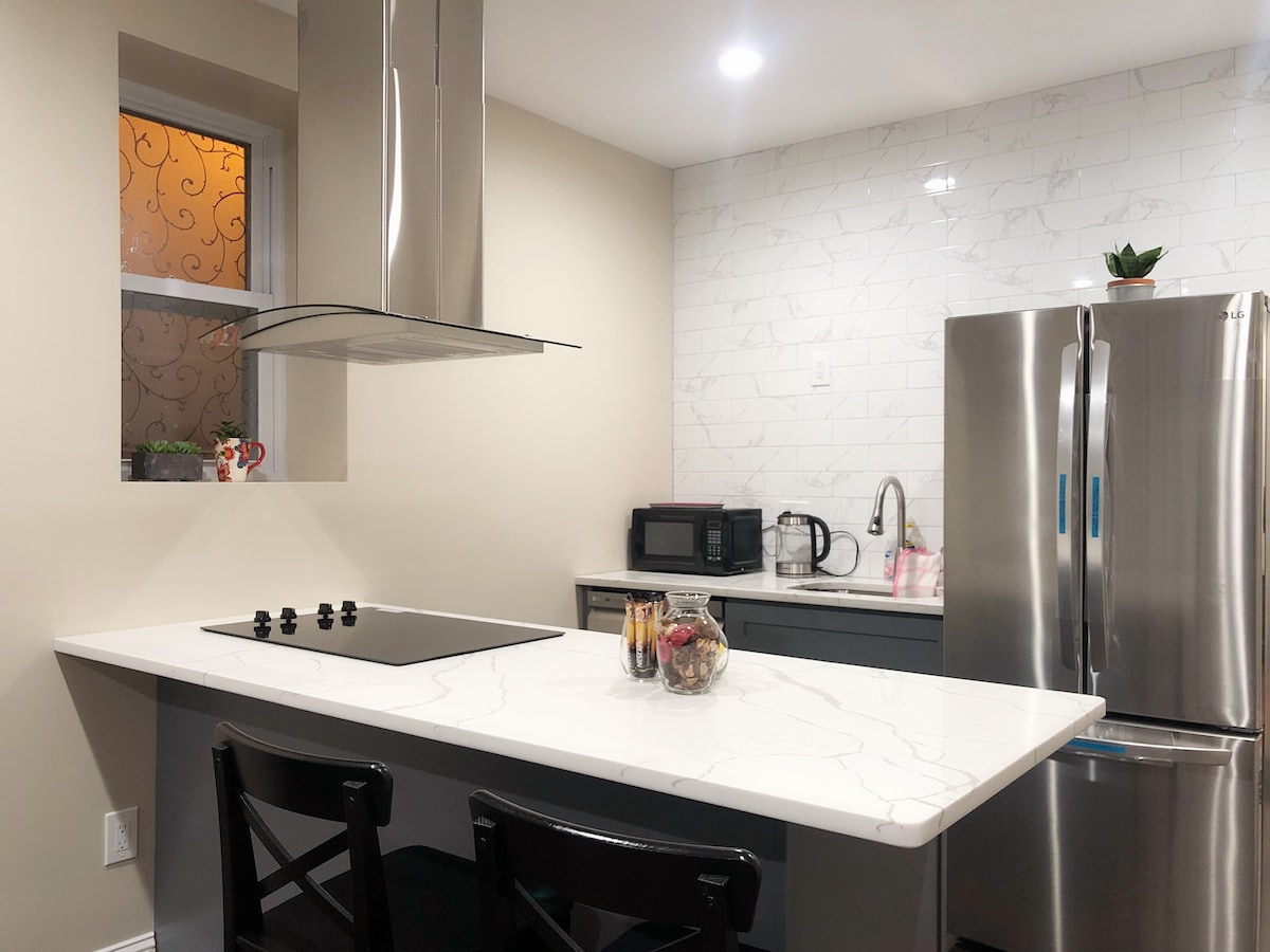 Beautiful modern 2 bedroom row home on a quiet block that is newly renovated for a very comfortable stay. Netflix, Amazon Prime, Alexa, Bluetooth speaker, Keyless entry and an Office with printer. The back patio/pergola and garden is great place to have your coffee in the mornings or an evening drink. Comfortable, quiet bedrooms with luxury memory foam mattresses, soft sheets and blackout shades. Cafe, bar and restaurant within a block.