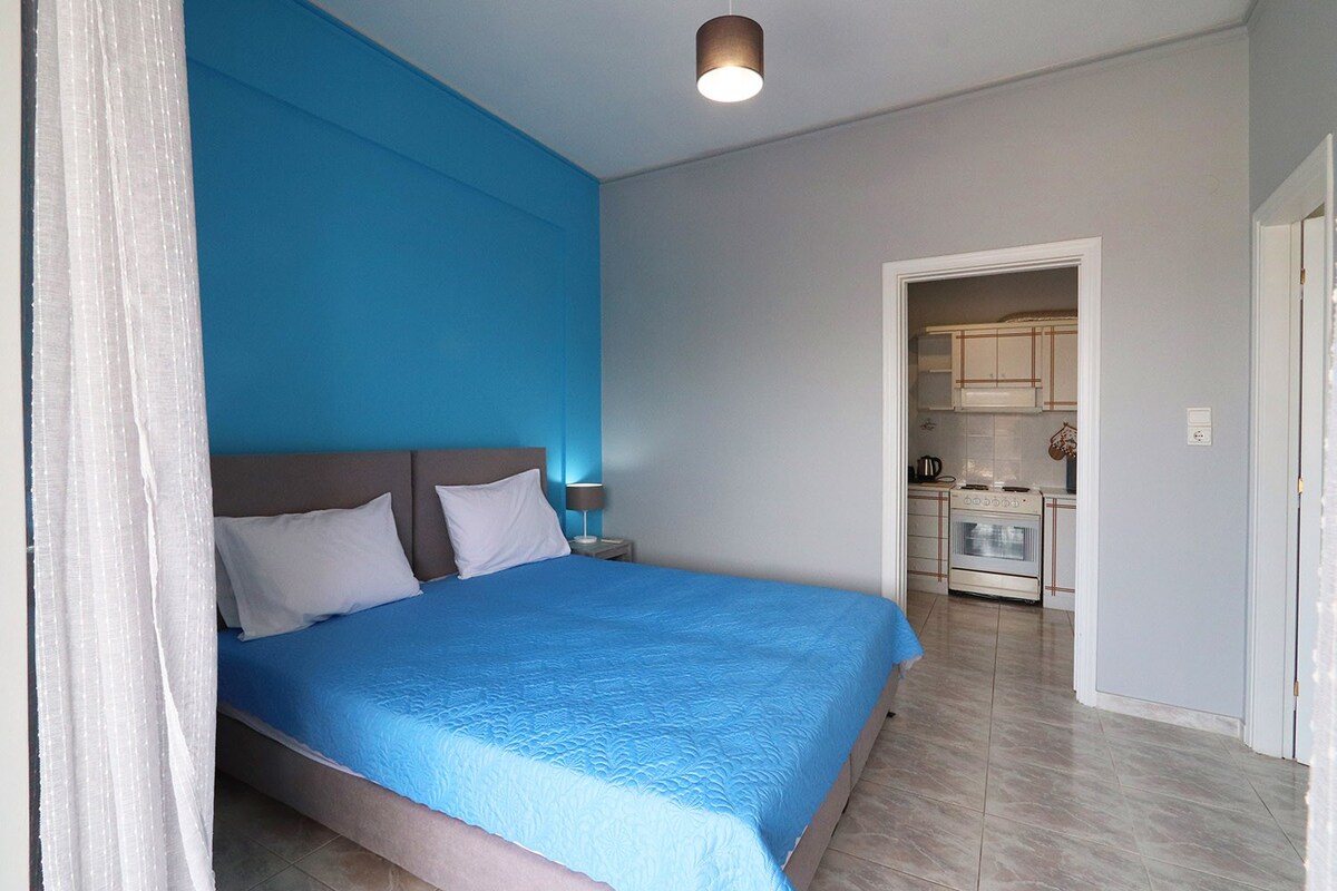 Relax on the 2 double beds and enjoy the unique panoramic view that combines the sea at a very close distance, mountains, beach, village and town of Edipsos. My apartment is located 200 meters from beach of Agios Nikolaos. Two cozy rooms, new Bathroom, Full Kitchen equipment, big Balcony (12 sqm) and 2 Gardens, with grass & plants and a Unique Composition of White Olive Trees and 50 Jars in bronze color with yellow flowers. Private Parking inside property. 10 Minutes by car from Aidipsos.