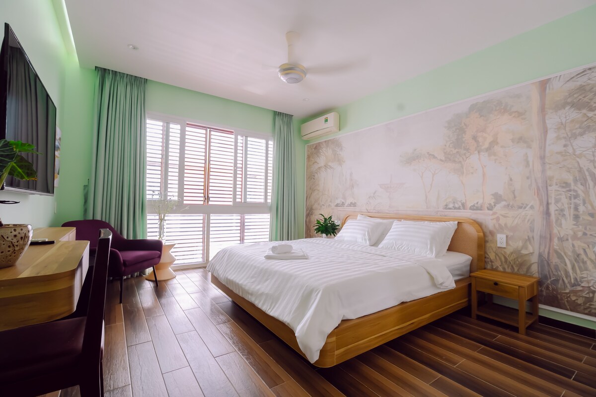 Conceput pentru șederi de scurtă durată sau de lungă durată, studioul minimalist are 2 paturi matrimoniale, bucătărie completă și baie proprie cu duș cu efect de ploaie. Cel mai bun aspect al acestei unități este „livingul” nostru, un lounge scufundat plin cu perne de pluș și perne care se deschid într-o grădină mică. Este într-adevăr locul perfect pentru a te relaxa și a citi o carte. Oaspeții vor avea, de asemenea, acces la o bucătărie comună mai mare, o zonă de coworking și o mașină de spălat/uscător automat de rufe. Suntem la doar 15 minute de aeroport și la 15 minute de piața Ben Thanh!