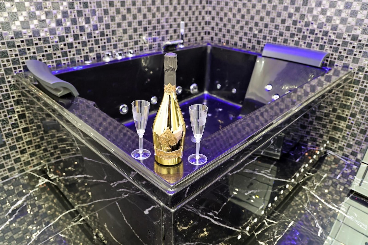 Apartament cu jacuzzi și saună privată. Echipat cu o intrare privată, acest apartament cu aer condiționat este format din 1 living, 1 dormitor separat și 1 baie cu cabină de duș și cadă. În bucătăria bine echipată vei găsi un frigider, vase, un cuptor și un cuptor cu microunde. Apartament dotat cu pereți izolați fonic, TV cu ecran plat cu servicii de streaming, vedere la oraș și vin/șampanie pentru oaspeți. Unitatea găzduiește 4.