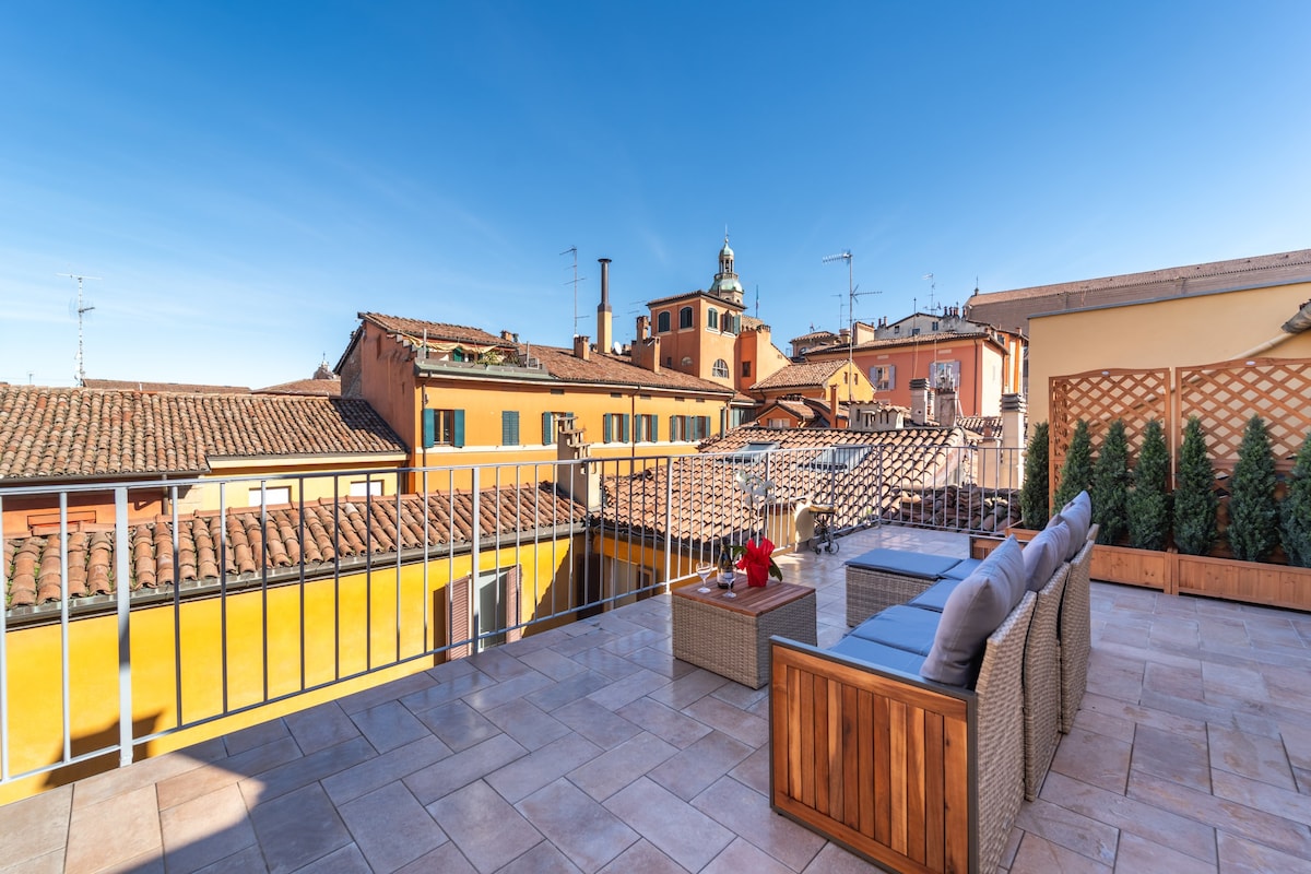 Apartament recent renovat în inima centrului orașului, la o aruncătură de băț de Piazza Maggiore. Apartamentul pe două niveluri este format din două dormitoare cu băi respective, living cu bucătărie la etajul inferior, două terase (una pe etaj), un mezanin și o spălătorie. Apartamentul este dotat cu tot confortul și are un loc de parcare acoperit în clădire. Din apartament poți admira o priveliște splendidă asupra acoperișurilor din Bologna, Torre degli Asinelli și San Petronio incluse și dealurile bologneze