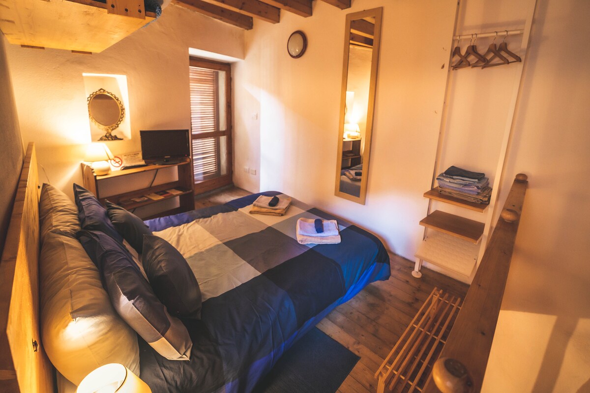 Vedere uluitoare din living și balcon, precum și de pe terasa privată. Apartamentul este amenajat pe două niveluri conectate printr-o scară interioară: livingul are o canapea, dormitorul are un pat dublu și o singură canapea care poate fi transformată într-un pat de o persoană. Un mediu cald și confortabil, cu elemente de perete de piatră și grinzi expuse, cufundate în liniștea satului caracteristic Blevio.