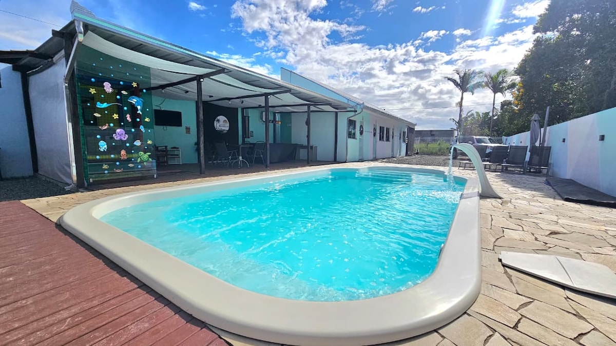 Dormitorul are un pat dublu, confortabil și confortabil, cu aer condiționat. Casa are camere comune cu alți oaspeți și cu proprietarul, fiind bucătărie, baie și zonă de agrement cu piscină. Avem animale de companie în casă, toate rezultatul salvării. Există 5 câini și o pisică, toți blânzi și obișnuiți cu oaspeții. Casa se află la aproximativ 180 m de plajă, în centrul orașului Piçarras. În apropiere se află o farmacie, o piață, restaurante și brutărie.