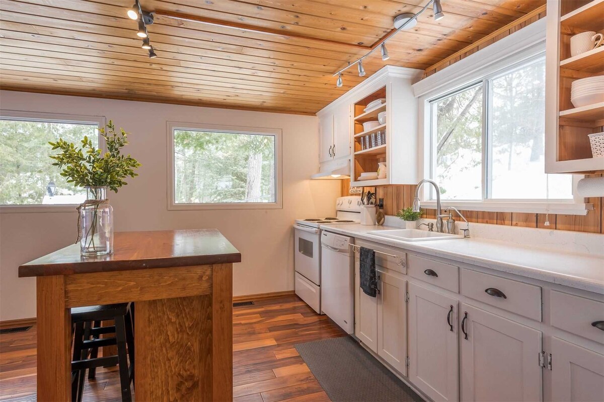 Bucură-te de priveliști panoramice asupra lacului Lower Buckhorn cu familia! Relaxează-te cocoțat în cada cu hidromasaj de pe stâncile Scutului Canadian, cuibărit printre pinii înalți. Această cabană pe malul apei, recent actualizată, are 3 dormitoare și un spațiu deschis de locuit. Peste 280 de picioare de malul apei pentru a vă bucura de răsărit și apusuri de soare și pentru a pescui de pe doc! Simte-te confortabil pe canapea, joacă-te sau vizionează filme. Fă o plimbare pe insulă. Wi-Fi de mare viteză pentru a lucra sau a te juca. 6 minute până în oraș, la mai puțin de 2 ore de GTA.